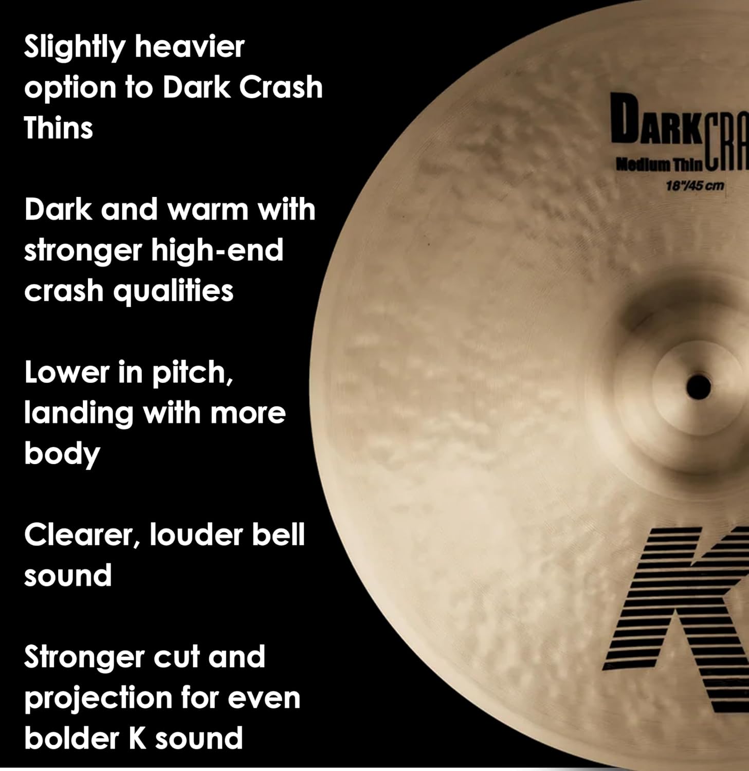 Slightly heavier than the Dark Crash Thins, the K Dark Crash Medium Thins are dark and warm, with stronger high-end crash qualities. Crashes emit a lower pitch, land with more body. They have a clearer and louder bell sound, and feature stronger cut and projection for an even bolder K sound.