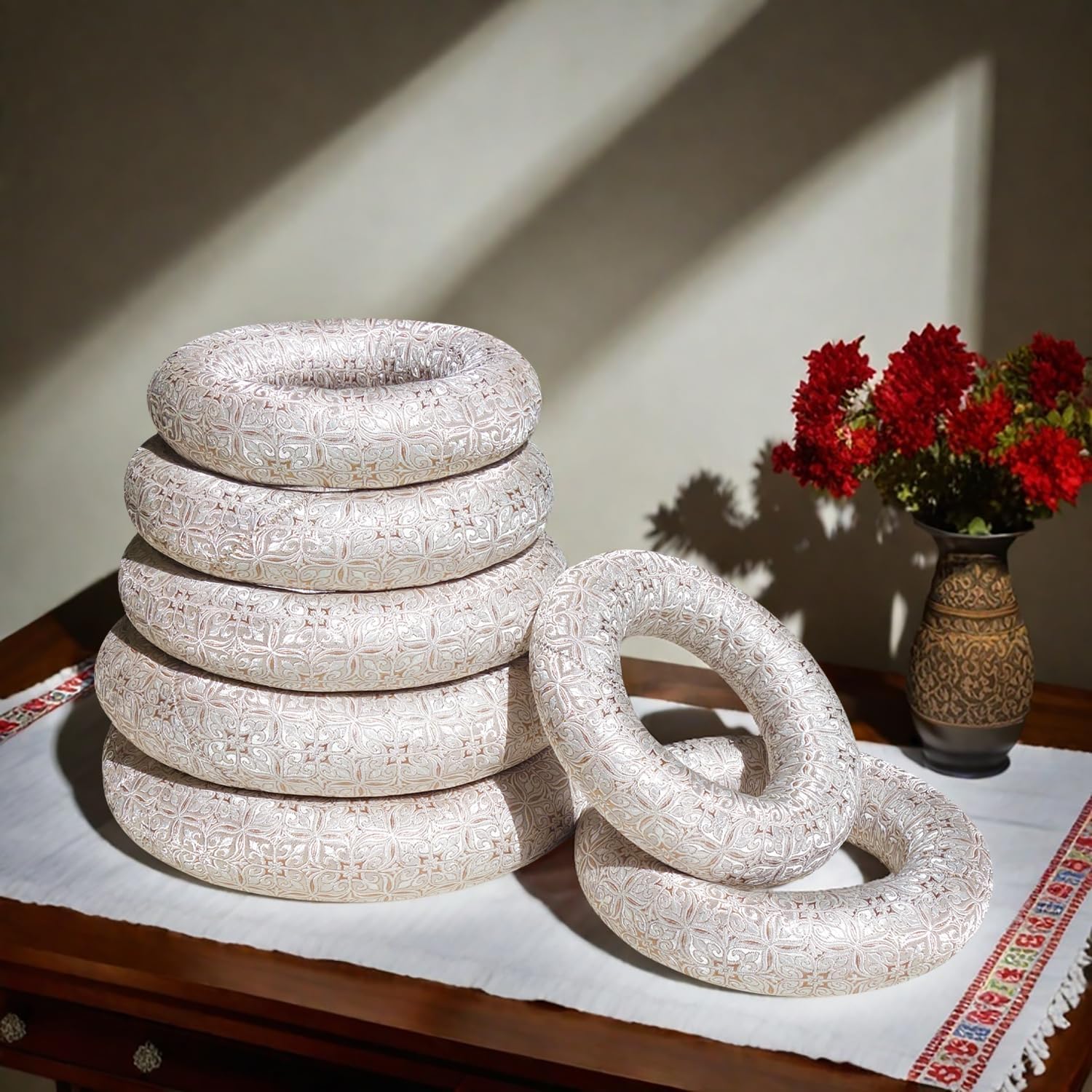 The high-quality singing bowl cushions are designed specifically for Tibetan singing bowls, this premium singing bowl pillow provides a stable and vibration-friendly base that can firmly support standard-sized singing bowls such as 6-12 inches, allowing your singing bowl to resonate clearly and beautifully, making it ideal for meditation, yoga, and sound healing enthusiasts.Our singing bowl pillows are carefully handcrafted and made of high-quality, durable materials to ensure long-lasting durability. The elegant design blends seamlessly with any decor, making it the perfect addition to your meditation space, yoga studio, or sound healing room.Whether you are an experienced practitioner or a beginner, this singing bowl mat is an essential tool to enhance your spiritual relaxation and sound healing sessions.Notes:The sizes of the singing bowl cushions set are: 5.7 inch/14.5 cm, 6.3 inch/16 cm, 6.7 inch/17 cm, 7.1 inch/18 cm, 7.7 inch/19.5 cm, 8 inch/20.5 cm, 8.5 inch/21.5 cm. All sizes are measured manually, please allow slight mistakes.