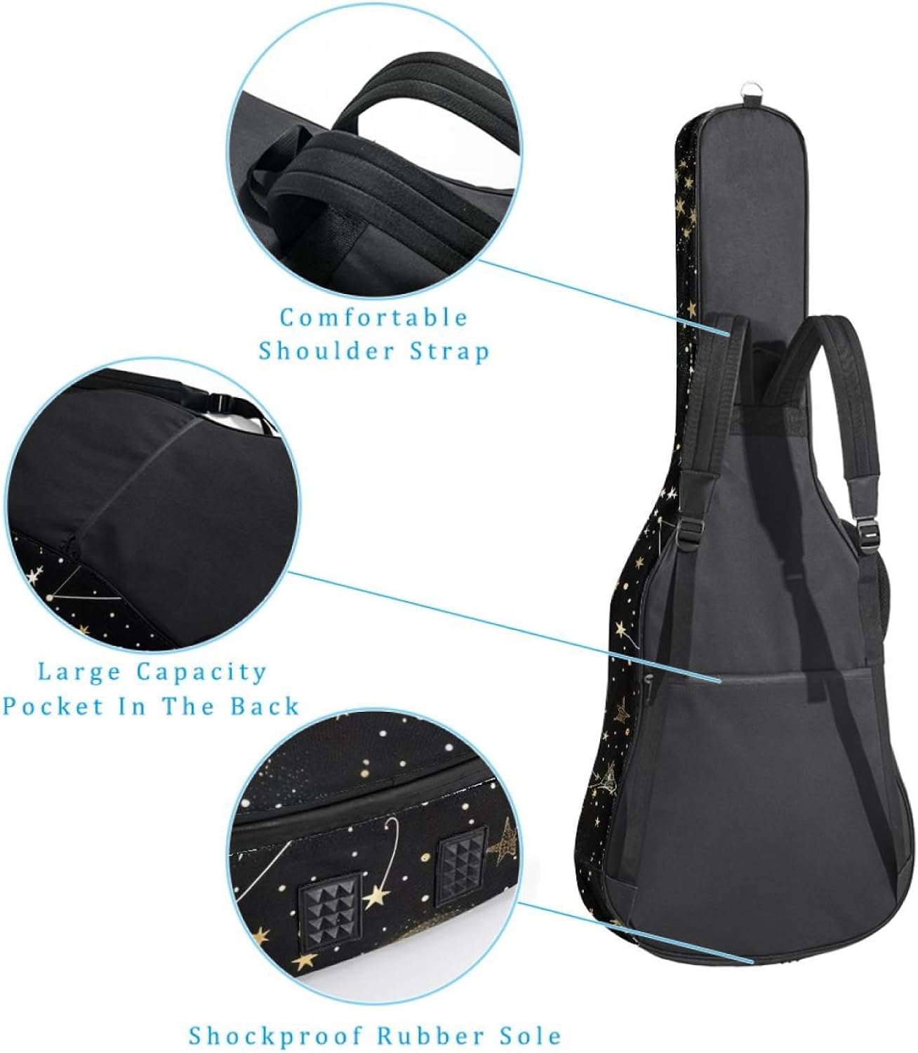 Specifications:Material: waterproof Oxford and waterproof zipper;Size: 42.9’’ x 16.9’’ x 4.7’’, perfect for 40'' 41'' 42'' guitar;Weight:36oz/1020g, lightweight;Color: Multi-color.Features:1. Adjustable backpack shoulder straps and padded side carry handle for more pleasant carrying choices.2. 10mm thick sponge padding inside provide protection for your musical instrument; and fixed Velcro above neck and body keep your acoustic guitar bag safer.3. This guitar bag comes with back hanger loop can be hung on the wall. Save more space when not in use.4. Two pockets for storage convenience, 1 large capacity pocket on outside back and 1 small pocket on the inside neck.5. Cute printed guitar gig bag guitar case backpack, ideal as a gift for your relatives or friends who love music when birthday, Thanksgiving, Christmas, holidays, and other special events.