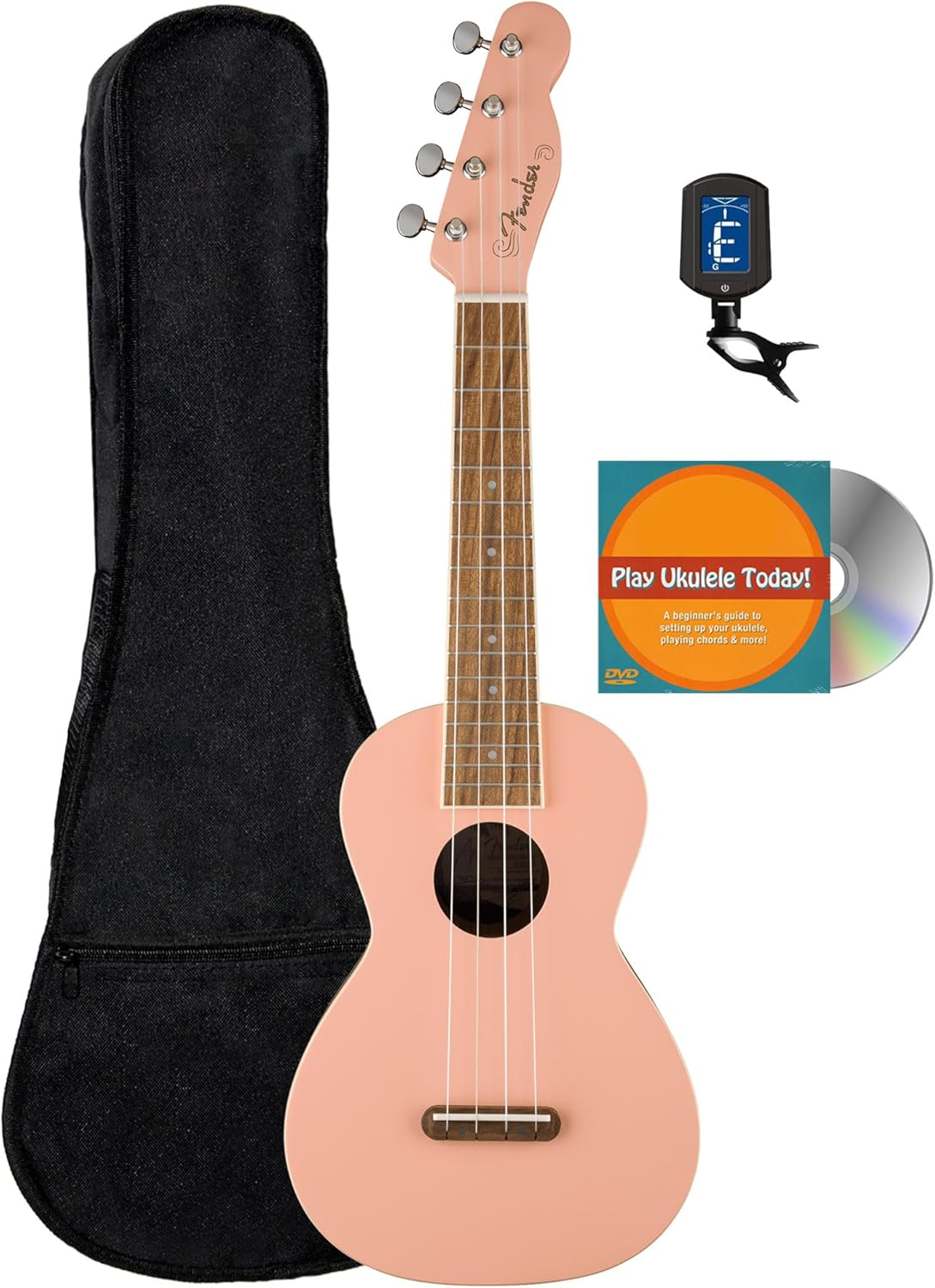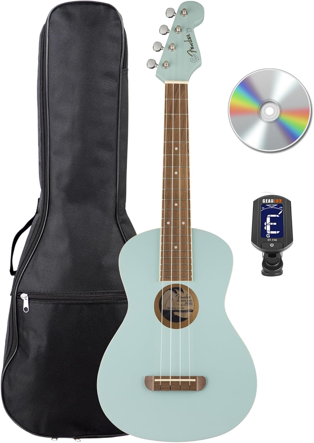 Fender created a soprano ukulele with a unique, carefree spirit vibe - the Venice Ukulele. Thanks to its compact, comfortable body size, the Venice travels quickly from the beach to the studio or jam room while retaining the classic, light sound that made the ukulele a "must-have" for today's players. The Venice Ukulele features a slim 'C'-shaped neck profile that is comfortable to hold and makes playing a breeze. The no-tie bridge ensures that changing strings is a simple task. The stylish bound top and 4-in-line Tele headstock add a unique touch of Fender style that sets this ukulele apart.Series: California Coast Ukuleles Orientation: Right-HandColor: Sonic GrayInstrument Type: UkuleleCountry Of Origin: CNNeck Material: NatoNeck Finish: Satin Urethane Fingerboard Radius: FlatFingerboard Material: Laminated HardwoodBody: Laminated Basswood Top, Back, and SidesBody Finish: SatinBody Shape: Soprano UkuleleBody Top: Laminated BasswoodBody Binding: CreamBody Back: Laminated BasswoodBody Sides: Laminated BasswoodDimensions: 3.50x6.00x23.80 INShipping Weight: 5.00 LB Fret Size: 1.5mmScale Length: 13.6" (345 mm)Shipping Length: 23.80 INShipping Height: 3.50 INShipping Width: 6.00 INAdding value to your purchase, Austin Bazaar bundles your instrument with necessary accessories to provide you with the best experience. This bundle includes a gig bag to protect your instrument from outer damage; a tuner is included to keep your instrument in tune, and an Austin Bazaar instructional video is included to get some tips and learning on your instrument.WARNING: Cancer and Reproductive Harm - www.P65Warnings.ca.gov.
