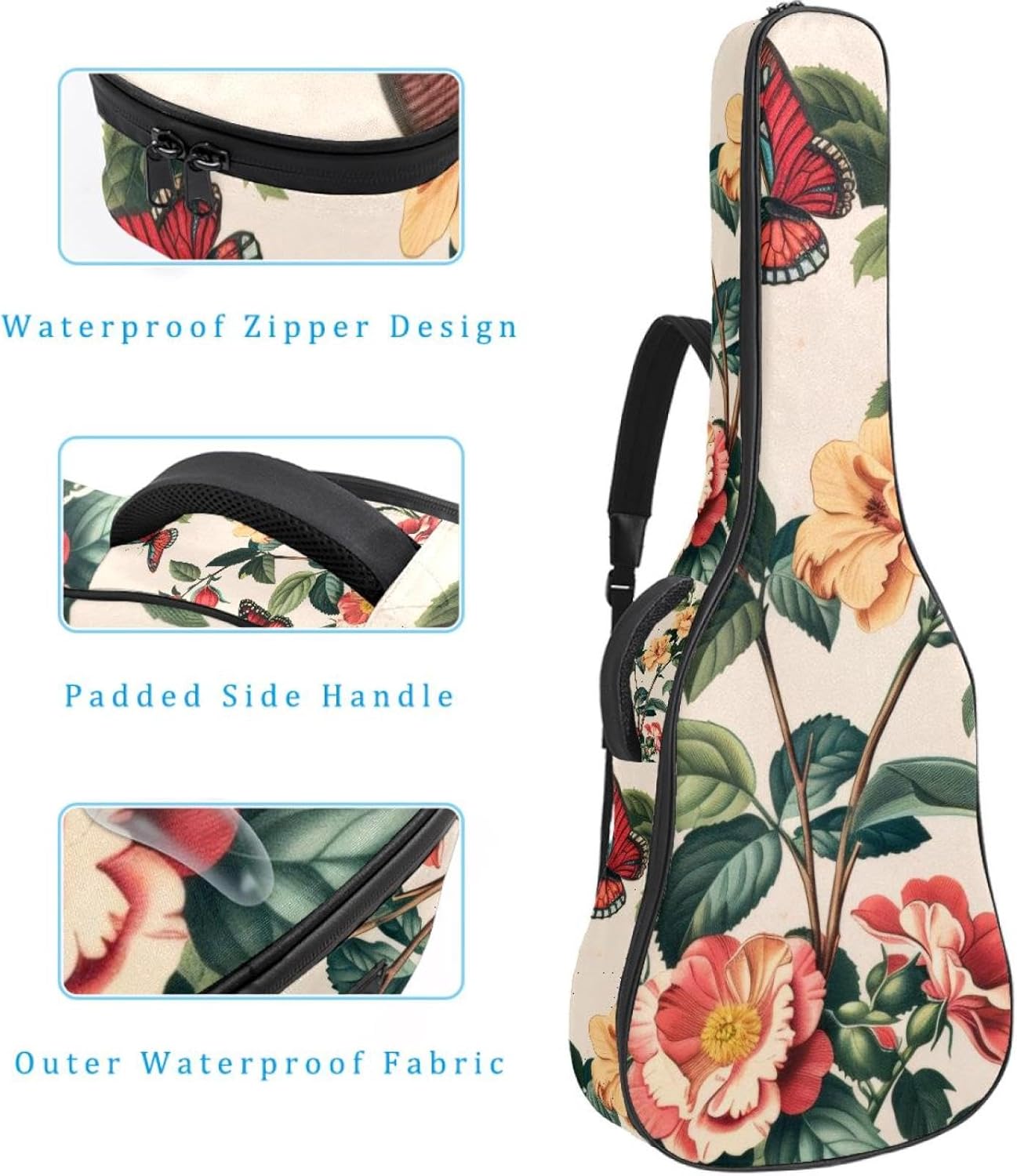 Specifications:Material: waterproof Oxford and waterproof zipper;Size: 42.9’’ x 16.9’’ x 4.7’’, perfect for 40'' 41'' 42'' guitar;Weight:36oz/1020g, lightweight;Color: Multi-color.Features:1. Adjustable backpack shoulder straps and padded side carry handle for more pleasant carrying choices.2. 10mm thick sponge padding inside provide protection for your musical instrument; and fixed Velcro above neck and body keep your acoustic guitar bag safer.3. This guitar bag comes with back hanger loop can be hung on the wall. Save more space when not in use.4. Two pockets for storage convenience, 1 large capacity pocket on outside back and 1 small pocket on the inside neck.5. Cute printed guitar gig bag guitar case backpack, ideal as a gift for your relatives or friends who love music when birthday, Thanksgiving, Christmas, holidays, and other special events.