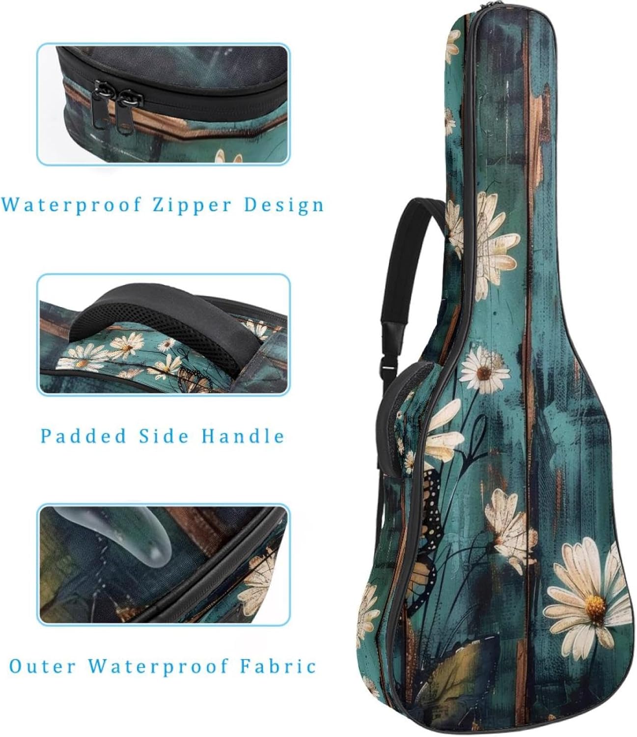 Specifications:Material: waterproof Oxford and waterproof zipper;Size: 42.9’’ x 16.9’’ x 4.7’’, perfect for 40'' 41'' 42'' guitar;Weight:36oz/1020g, lightweight;Color: Multi-color.Features:1. Adjustable backpack shoulder straps and padded side carry handle for more pleasant carrying choices.2. 10mm thick sponge padding inside provide protection for your musical instrument; and fixed Velcro above neck and body keep your acoustic guitar bag safer.3. This guitar bag comes with back hanger loop can be hung on the wall. Save more space when not in use.4. Two pockets for storage convenience, 1 large capacity pocket on outside back and 1 small pocket on the inside neck.5. Cute printed guitar gig bag guitar case backpack, ideal as a gift for your relatives or friends who love music when birthday, Thanksgiving, Christmas, holidays, and other special events.