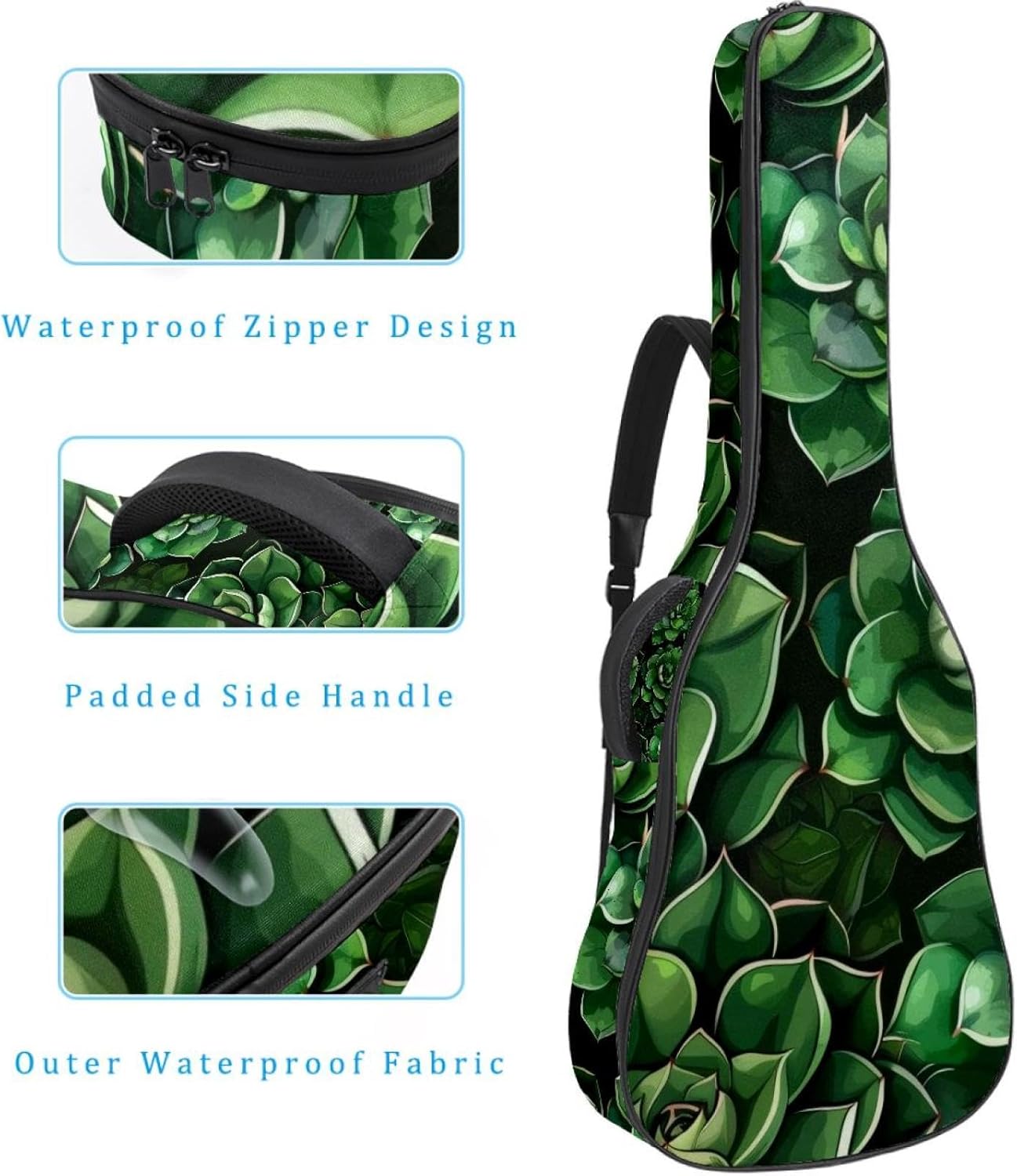 Specifications:Material: waterproof Oxford and waterproof zipper;Size: 42.9’’ x 16.9’’ x 4.7’’, perfect for 40'' 41'' 42'' guitar;Weight:36oz/1020g, lightweight;Color: Multi-color.Features:1. Adjustable backpack shoulder straps and padded side carry handle for more pleasant carrying choices.2. 10mm thick sponge padding inside provide protection for your musical instrument; and fixed Velcro above neck and body keep your acoustic guitar bag safer.3. This guitar bag comes with back hanger loop can be hung on the wall. Save more space when not in use.4. Two pockets for storage convenience, 1 large capacity pocket on outside back and 1 small pocket on the inside neck.5. Cute printed guitar gig bag guitar case backpack, ideal as a gift for your relatives or friends who love music when birthday, Thanksgiving, Christmas, holidays, and other special events.