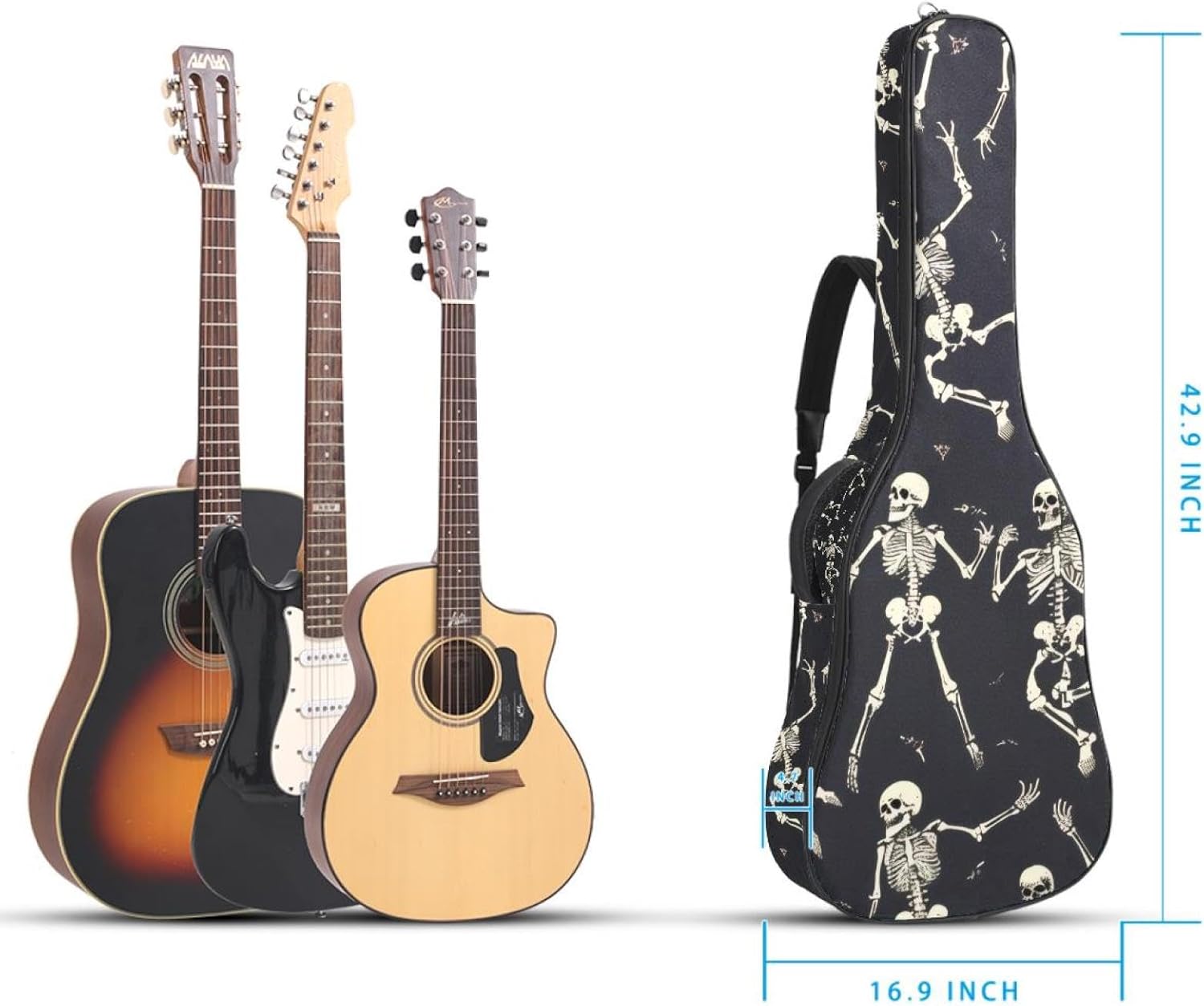 Specifications:Material: waterproof Oxford and waterproof zipper;Size: 42.9’’ x 16.9’’ x 4.7’’, perfect for 40'' 41'' 42'' guitar;Weight:36oz/1020g, lightweight;Color: Multi-color.Features:1. Adjustable backpack shoulder straps and padded side carry handle for more pleasant carrying choices.2. 10mm thick sponge padding inside provide protection for your musical instrument; and fixed Velcro above neck and body keep your acoustic guitar bag safer.3. This guitar bag comes with back hanger loop can be hung on the wall. Save more space when not in use.4. Two pockets for storage convenience, 1 large capacity pocket on outside back and 1 small pocket on the inside neck.5. Cute printed guitar gig bag guitar case backpack, ideal as a gift for your relatives or friends who love music when birthday, Thanksgiving, Christmas, holidays, and other special events.