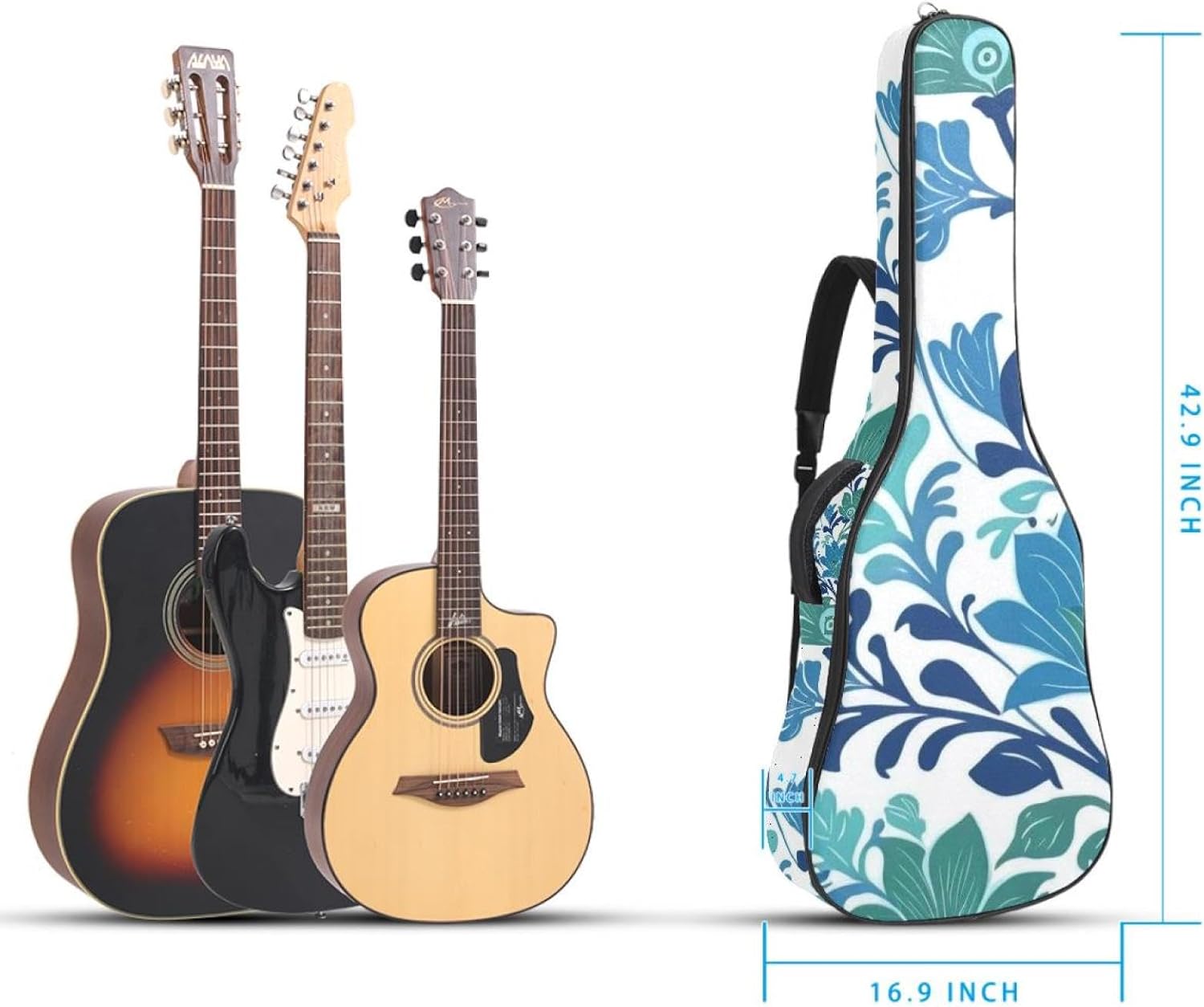This versatile guitar gig bag is the perfect accessory for any musician needing reliable protection and easy portability for their instrument.With dimensions of 42.9x16.9x4.7 inches, this gig bag accommodates a wide range of guitars, including electric, bass, acoustic, and classical. The waterproof Oxford fabric construction ensures your guitar remains protected from the elements, while the heavy-duty rubber base shields it from everyday knocks and bumps.Inside, the bag features a generously padded design with adjustable neck support to secure your guitar during transit. The smooth lining and anti-scratch fabric offer additional peace of mind, knowing your guitar is safe from scratches and damage. Practical storage solutions include two spacious pockets for neatly organizing essential guitar accessories, ensuring quick access when needed.Whether you're heading to a gig, a rehearsal, or simply storing your instrument, this guitar case offers a practical and reliable solution for musicians of all ages and skill levels.