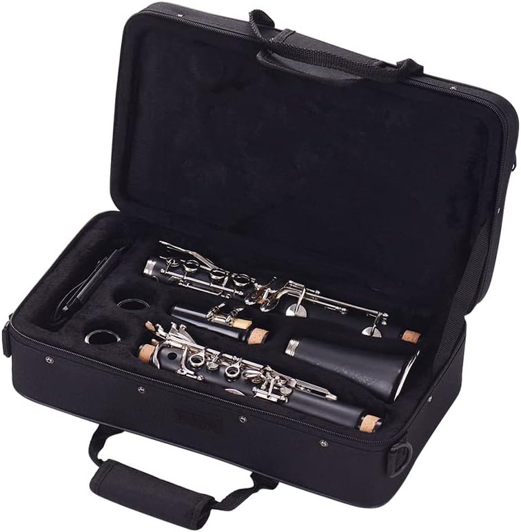 Specifications: Color: Black Material: ABS + cupronickel Key: Bb Case Size: 36 * 20 * 10.5cm/ 14.2 * 7.9 * 4.1in Item Size: 66.5 * 8cm/ 26.2 * 3.1in Item Weight: 710g/ 1.6lbs Package Size: 37.5 * 23 * 12.5cm/ 14.8 * 9.1 * 4.9in Package Weight: 1547g/ 3.4lbs Package List: 1 * Clarinet 2 * Cleaning Cloth 1 * Pair of Gloves 1 * Mini Screwdriver 1 * Box of Reed(10pcs) 1 * Reed Case 1 * Carry Case 1 * Strap