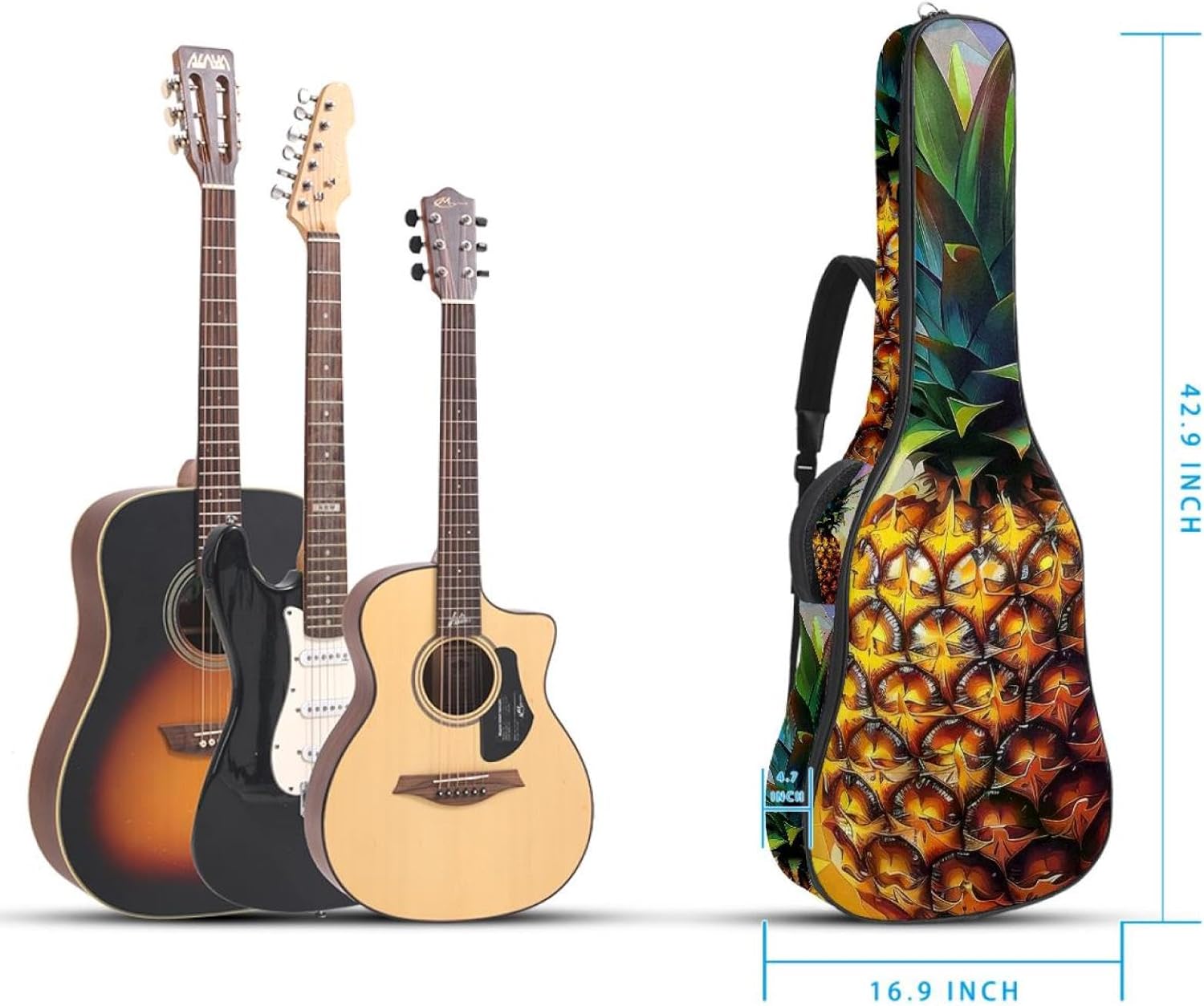Specifications:Material: waterproof Oxford and waterproof zipper;Size: 42.9’’ x 16.9’’ x 4.7’’, perfect for 40'' 41'' 42'' guitar;Weight:36oz/1020g, lightweight;Color: Multi-color.Features:1. Adjustable backpack shoulder straps and padded side carry handle for more pleasant carrying choices.2. 10mm thick sponge padding inside provide protection for your musical instrument; and fixed Velcro above neck and body keep your acoustic guitar bag safer.3. This guitar bag comes with back hanger loop can be hung on the wall. Save more space when not in use.4. Two pockets for storage convenience, 1 large capacity pocket on outside back and 1 small pocket on the inside neck.5. Cute printed guitar gig bag guitar case backpack, ideal as a gift for your relatives or friends who love music when birthday, Thanksgiving, Christmas, holidays, and other special events.