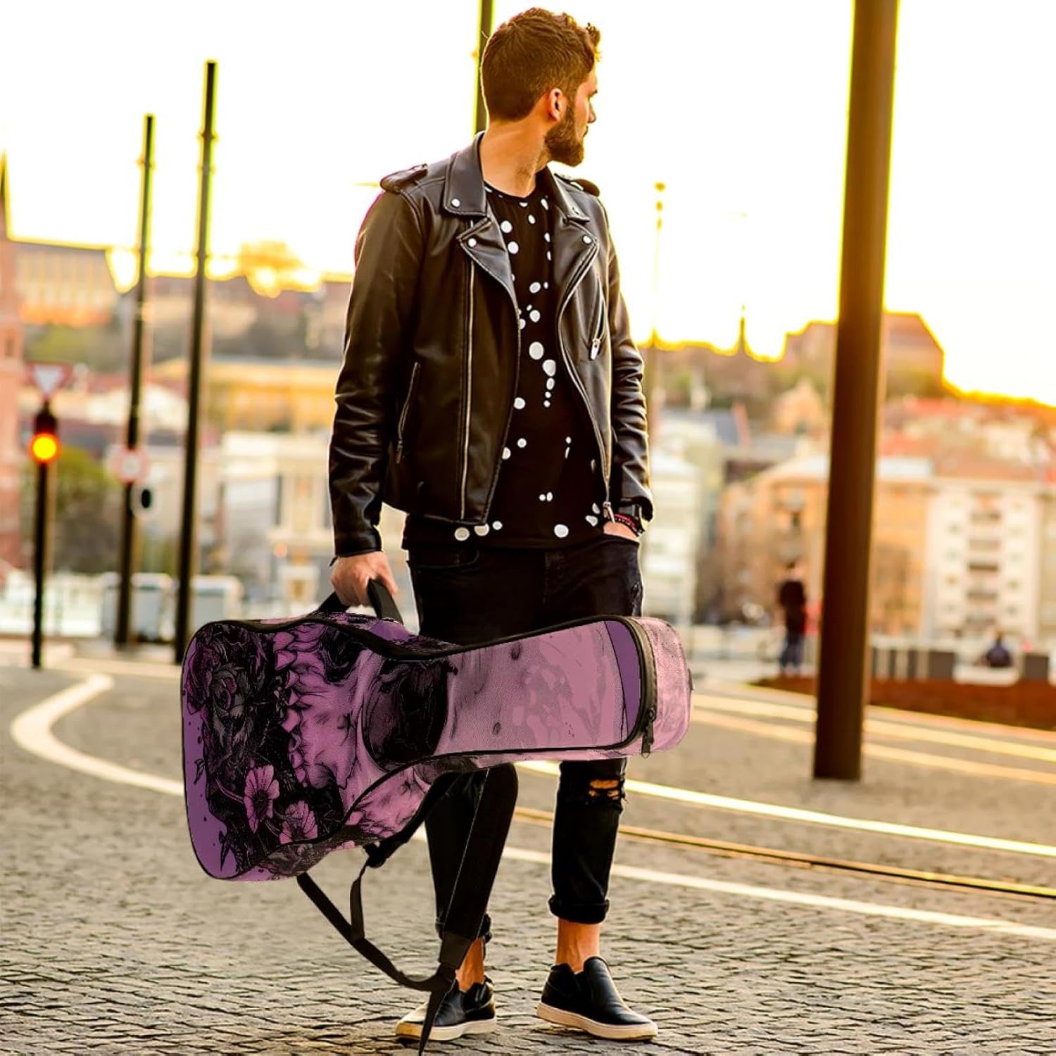 Specifications:Material: waterproof Oxford and waterproof zipper;Size: 42.9’’ x 16.9’’ x 4.7’’, perfect for 40'' 41'' 42'' guitar;Weight:36oz/1020g, lightweight;Color: Multi-color.Features:1. Adjustable backpack shoulder straps and padded side carry handle for more pleasant carrying choices.2. 10mm thick sponge padding inside provide protection for your musical instrument; and fixed Velcro above neck and body keep your acoustic guitar bag safer.3. This guitar bag comes with back hanger loop can be hung on the wall. Save more space when not in use.4. Two pockets for storage convenience, 1 large capacity pocket on outside back and 1 small pocket on the inside neck.5. Cute printed guitar gig bag guitar case backpack, ideal as a gift for your relatives or friends who love music when birthday, Thanksgiving, Christmas, holidays, and other special events.