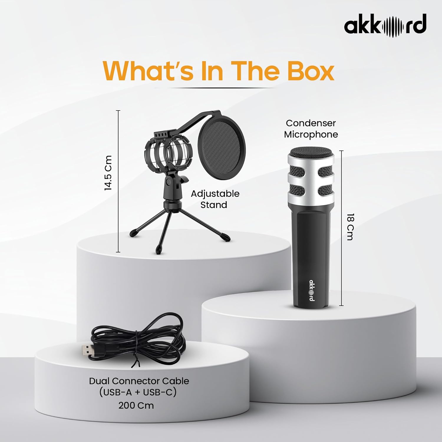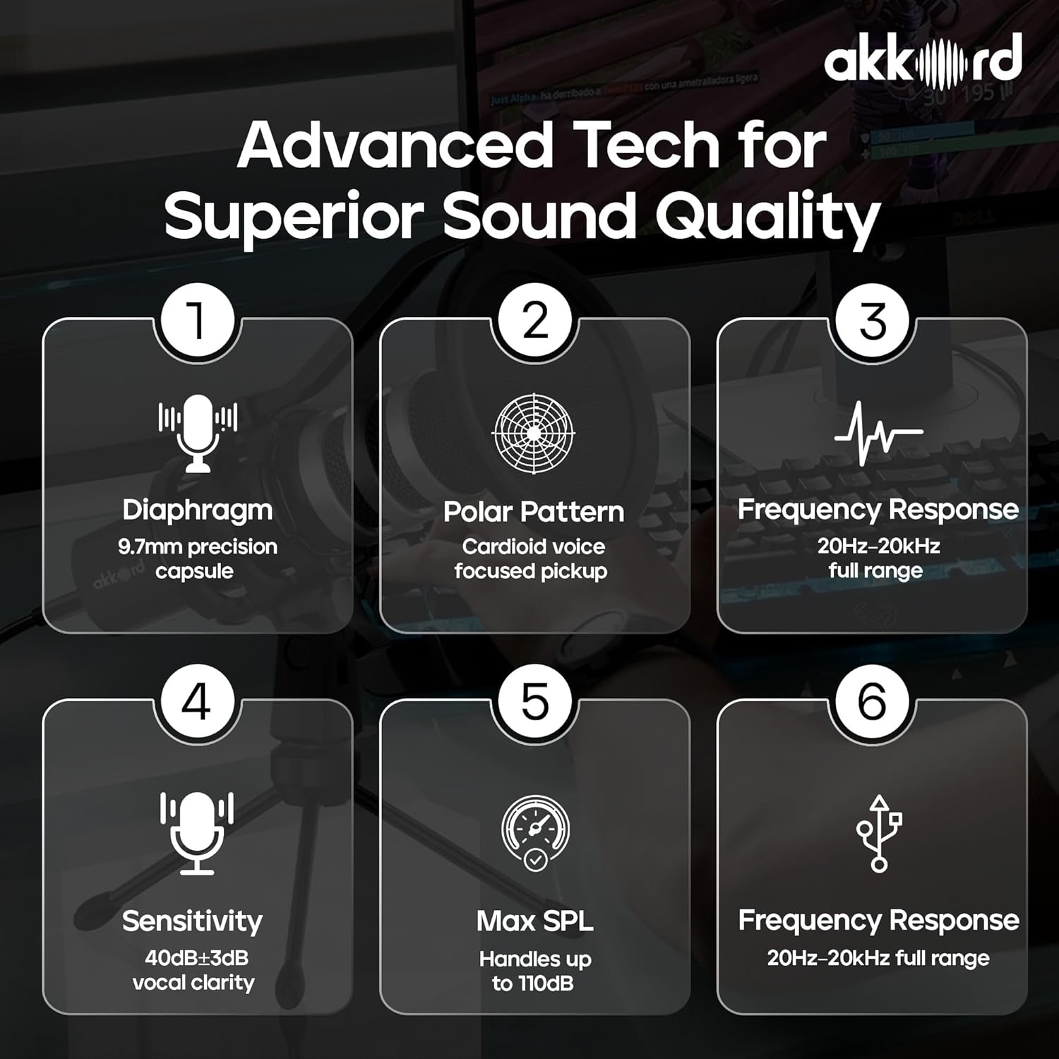 Product Description Akkord USB Microphone with Tripod Stand – 192kHz/24Bit Cardioid Condenser Mic, 9.7mm Diaphragm, Plug & Play for Podcasting, Streaming, Voice Recording, Gaming – for PC, Mac, Laptop Manufacturer Contact Information No.10,Xianzhi Road,Mawei District,Fuzhou,Fujian,China.