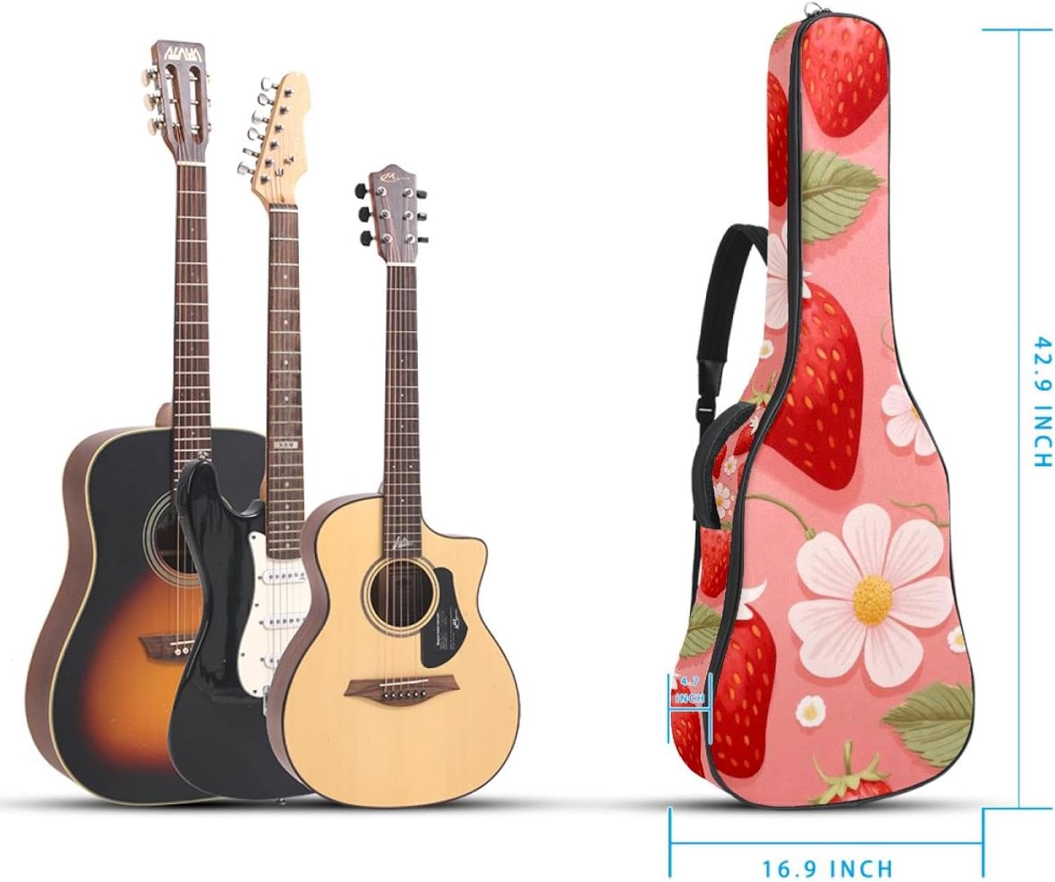 Specifications:Material: waterproof Oxford and waterproof zipper;Size: 42.9’’ x 16.9’’ x 4.7’’, perfect for 40'' 41'' 42'' guitar;Weight:36oz/1020g, lightweight;Color: Multi-color.Features:1. Adjustable backpack shoulder straps and padded side carry handle for more pleasant carrying choices.2. 10mm thick sponge padding inside provide protection for your musical instrument; and fixed Velcro above neck and body keep your acoustic guitar bag safer.3. This guitar bag comes with back hanger loop can be hung on the wall. Save more space when not in use.4. Two pockets for storage convenience, 1 large capacity pocket on outside back and 1 small pocket on the inside neck.5. Cute printed guitar gig bag guitar case backpack, ideal as a gift for your relatives or friends who love music when birthday, Thanksgiving, Christmas, holidays, and other special events.