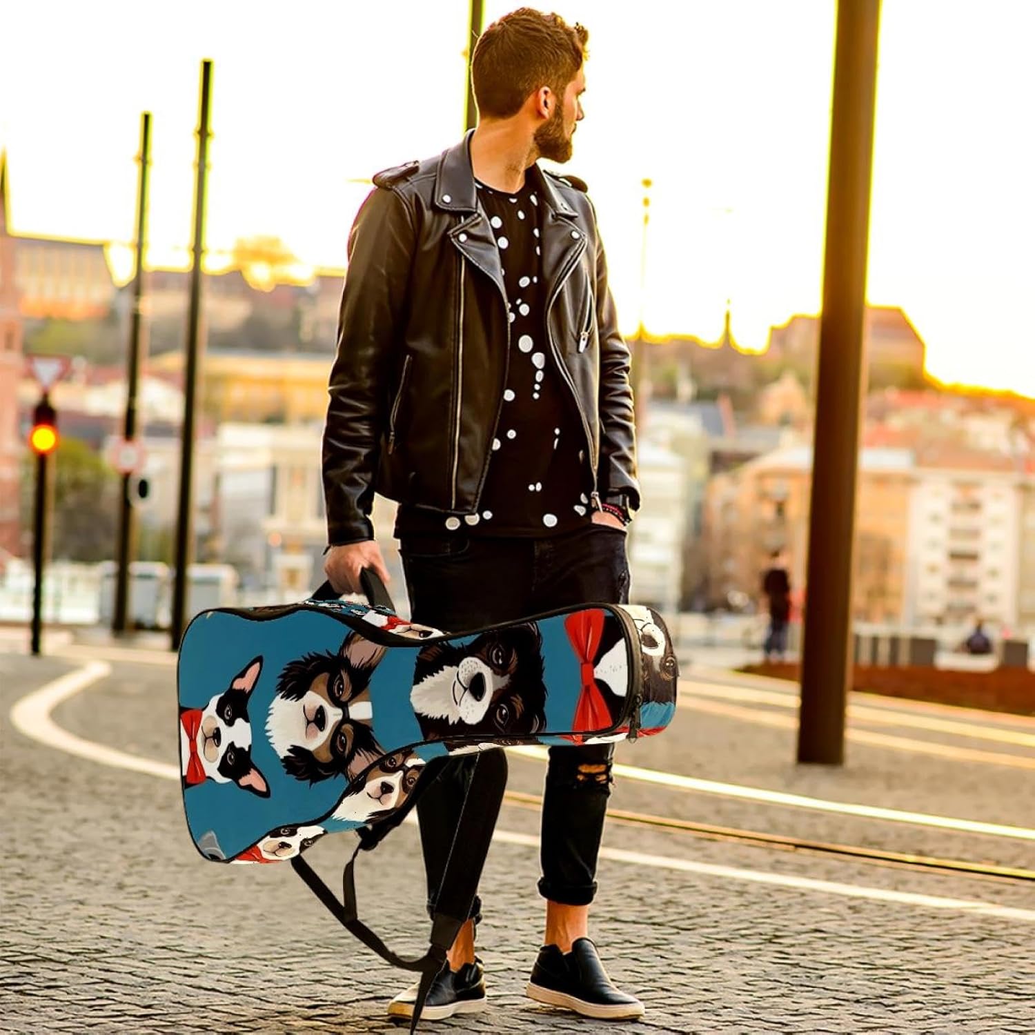 Specifications:Material: waterproof Oxford and waterproof zipper;Size: 42.9’’ x 16.9’’ x 4.7’’, perfect for 40'' 41'' 42'' guitar;Weight:36oz/1020g, lightweight;Color: Multi-color.Features:1. Adjustable backpack shoulder straps and padded side carry handle for more pleasant carrying choices.2. 10mm thick sponge padding inside provide protection for your musical instrument; and fixed Velcro above neck and body keep your acoustic guitar bag safer.3. This guitar bag comes with back hanger loop can be hung on the wall. Save more space when not in use.4. Two pockets for storage convenience, 1 large capacity pocket on outside back and 1 small pocket on the inside neck.5. Cute printed guitar gig bag guitar case backpack, ideal as a gift for your relatives or friends who love music when birthday, Thanksgiving, Christmas, holidays, and other special events.