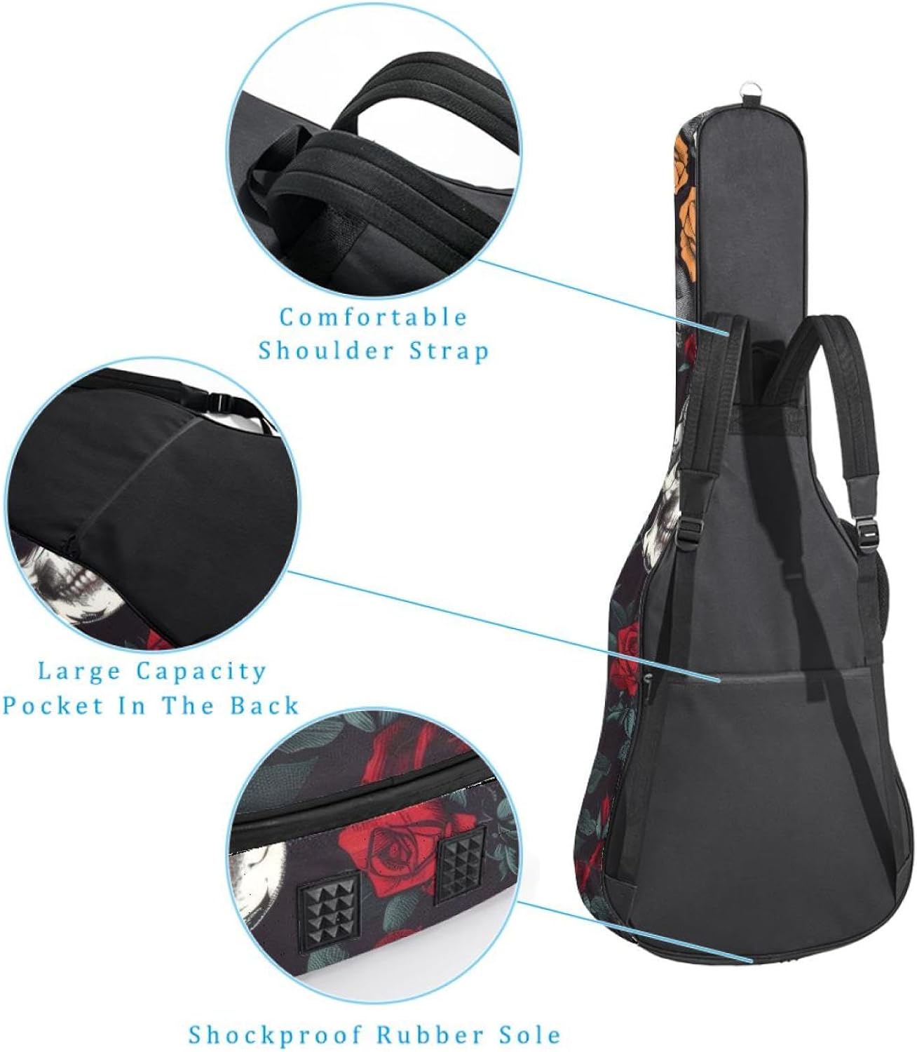 Specifications:Material: waterproof Oxford and waterproof zipper;Size: 42.9’’ x 16.9’’ x 4.7’’, perfect for 40'' 41'' 42'' guitar;Weight:36oz/1020g, lightweight;Color: Multi-color.Features:1. Adjustable backpack shoulder straps and padded side carry handle for more pleasant carrying choices.2. 10mm thick sponge padding inside provide protection for your musical instrument; and fixed Velcro above neck and body keep your acoustic guitar bag safer.3. This guitar bag comes with back hanger loop can be hung on the wall. Save more space when not in use.4. Two pockets for storage convenience, 1 large capacity pocket on outside back and 1 small pocket on the inside neck.5. Cute printed guitar gig bag guitar case backpack, ideal as a gift for your relatives or friends who love music when birthday, Thanksgiving, Christmas, holidays, and other special events.
