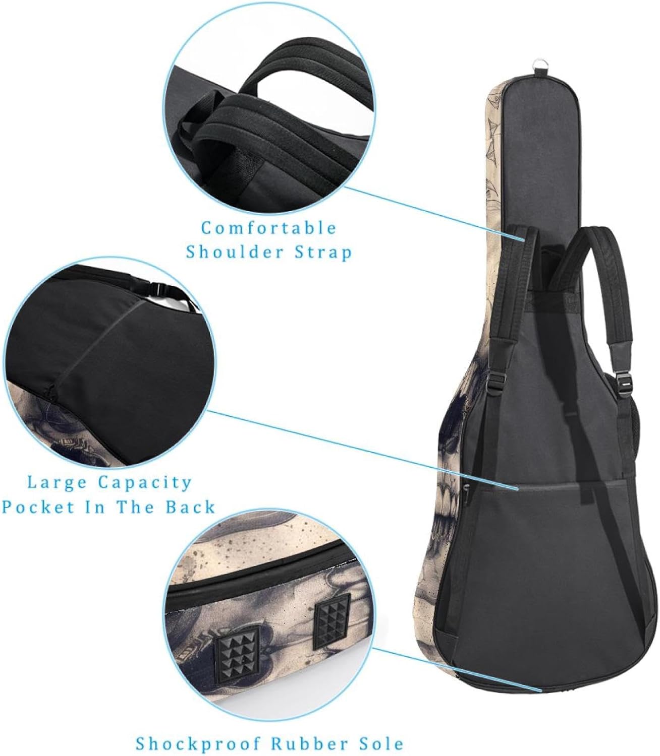 Specifications:Material: waterproof Oxford and waterproof zipper;Size: 42.9’’ x 16.9’’ x 4.7’’, perfect for 40'' 41'' 42'' guitar;Weight:36oz/1020g, lightweight;Color: Multi-color.Features:1. Adjustable backpack shoulder straps and padded side carry handle for more pleasant carrying choices.2. 10mm thick sponge padding inside provide protection for your musical instrument; and fixed Velcro above neck and body keep your acoustic guitar bag safer.3. This guitar bag comes with back hanger loop can be hung on the wall. Save more space when not in use.4. Two pockets for storage convenience, 1 large capacity pocket on outside back and 1 small pocket on the inside neck.5. Cute printed guitar gig bag guitar case backpack, ideal as a gift for your relatives or friends who love music when birthday, Thanksgiving, Christmas, holidays, and other special events.