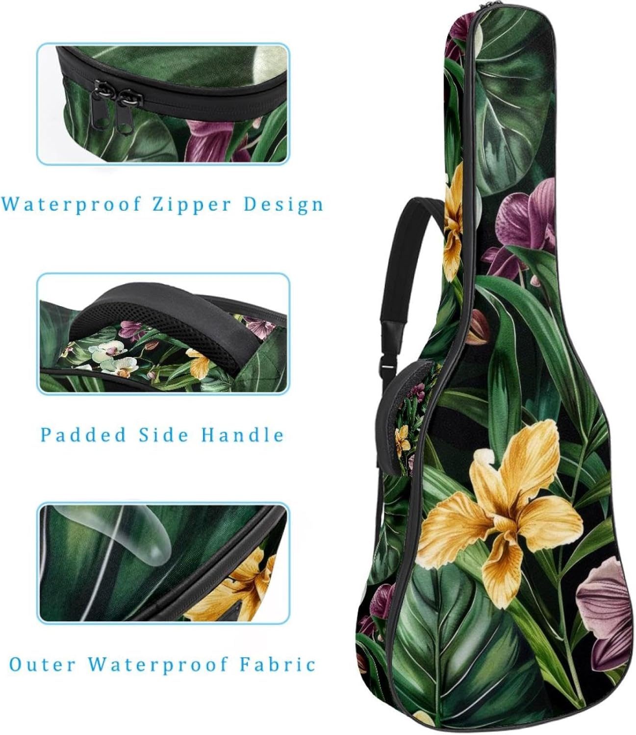 Specifications:Material: waterproof Oxford and waterproof zipper;Size: 42.9’’ x 16.9’’ x 4.7’’, perfect for 40'' 41'' 42'' guitar;Weight:36oz/1020g, lightweight;Color: Multi-color.Features:1. Adjustable backpack shoulder straps and padded side carry handle for more pleasant carrying choices.2. 10mm thick sponge padding inside provide protection for your musical instrument; and fixed Velcro above neck and body keep your acoustic guitar bag safer.3. This guitar bag comes with back hanger loop can be hung on the wall. Save more space when not in use.4. Two pockets for storage convenience, 1 large capacity pocket on outside back and 1 small pocket on the inside neck.5. Cute printed guitar gig bag guitar case backpack, ideal as a gift for your relatives or friends who love music when birthday, Thanksgiving, Christmas, holidays, and other special events.