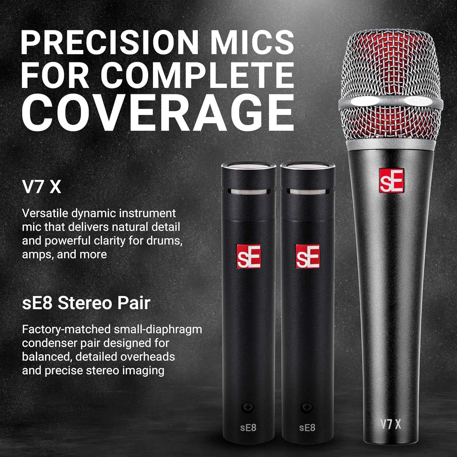 sE's V Pack Arena is designed to deliver effortlessly amazing sound for your entire drum kit in both live and studio environments. Thoughtfully curated and purpose-built, this professional drum microphone kit gives drummers and engineers everything they need to capture a powerful, balanced, and natural drum sound with confidence.The set includes one V KICK for bass drum, three V BEAT microphones paired with V CLAMPS for snare and toms, one V7 X dynamic instrument microphone for snare, and a factory-matched sE8 condenser microphone pair for overheads. Each microphone in this drum mic set is selected for its specific role, ensuring consistent tone, excellent isolation, and reliable performance across the entire kit. All components are securely housed in a rugged flight case for the highest level of protection.At the heart of this drum mic kit, the V KICK offers compact versatility and flexible tone shaping, allowing you to dial in everything from warm, classic sounds to more modern, aggressive character. The V BEAT microphones deliver highly detailed, natural sound on snares and toms, with excellent off-axis rejection and an ultra-compact footprint that keeps your setup clean. The included V CLAMP mounting system provides fast, secure attachment and precise positioning, making setup and tear-down faster than ever.For snare and other instruments, the V7 X dynamic microphone brings pristine full-bandwidth performance with a natural balance of detailed highs and deep, clear lows, while the sE8 stereo pair captures overheads with smooth, balanced detail, exceptional dynamic range, and precise stereo imaging.From its carefully selected microphone lineup to its road-ready flight case, the V Pack Arena is built for serious drummers and engineers who want a complete, professional drum miking solution that simply works โ delivering consistent, high-quality results show after show, session after session.