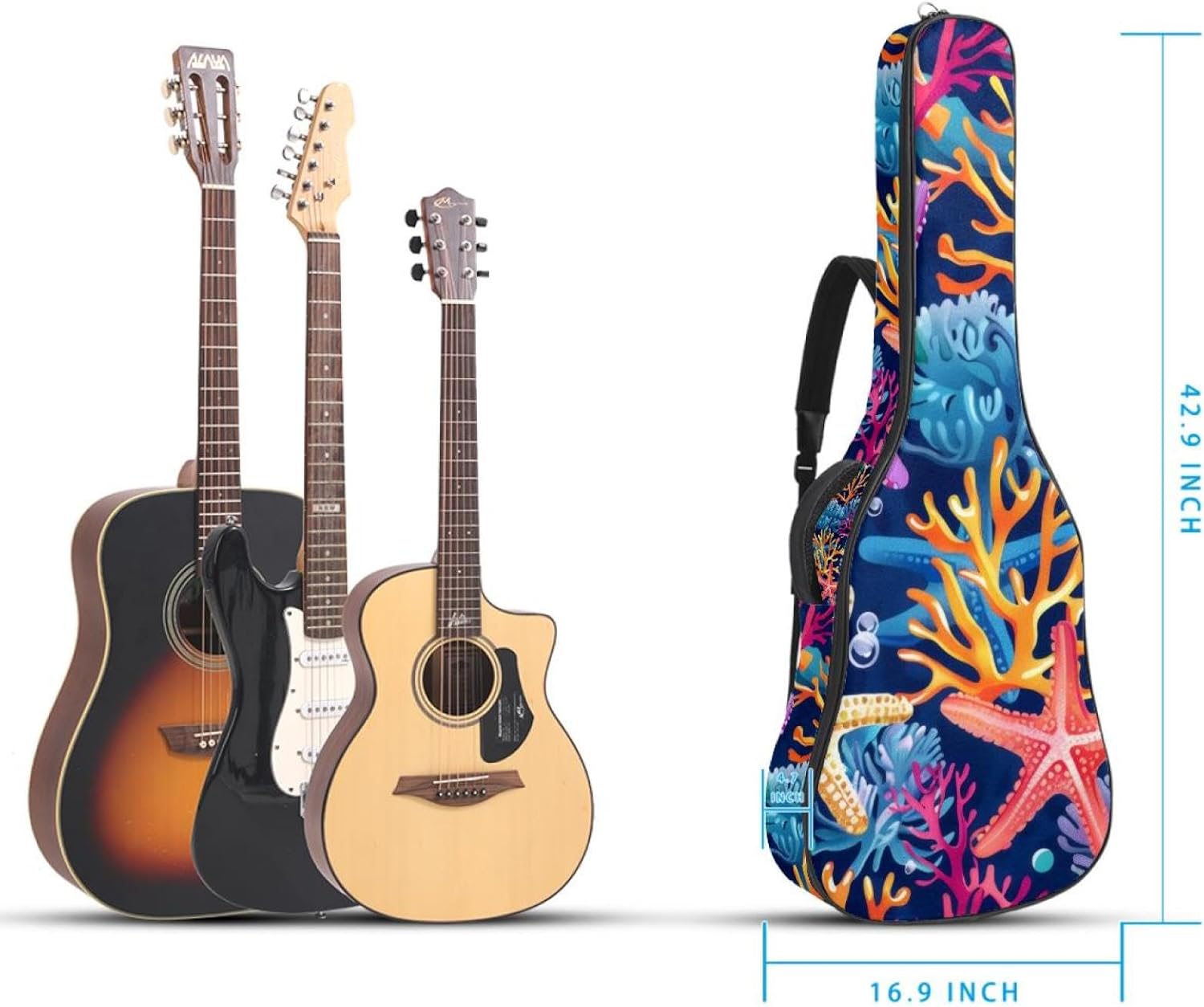 Specifications:Material: waterproof Oxford and waterproof zipper;Size: 42.9’’ x 16.9’’ x 4.7’’, perfect for 40'' 41'' 42'' guitar;Weight:36oz/1020g, lightweight;Color: Multi-color.Features:1. Adjustable backpack shoulder straps and padded side carry handle for more pleasant carrying choices.2. 10mm thick sponge padding inside provide protection for your musical instrument; and fixed Velcro above neck and body keep your acoustic guitar bag safer.3. This guitar bag comes with back hanger loop can be hung on the wall. Save more space when not in use.4. Two pockets for storage convenience, 1 large capacity pocket on outside back and 1 small pocket on the inside neck.5. Cute printed guitar gig bag guitar case backpack, ideal as a gift for your relatives or friends who love music when birthday, Thanksgiving, Christmas, holidays, and other special events.