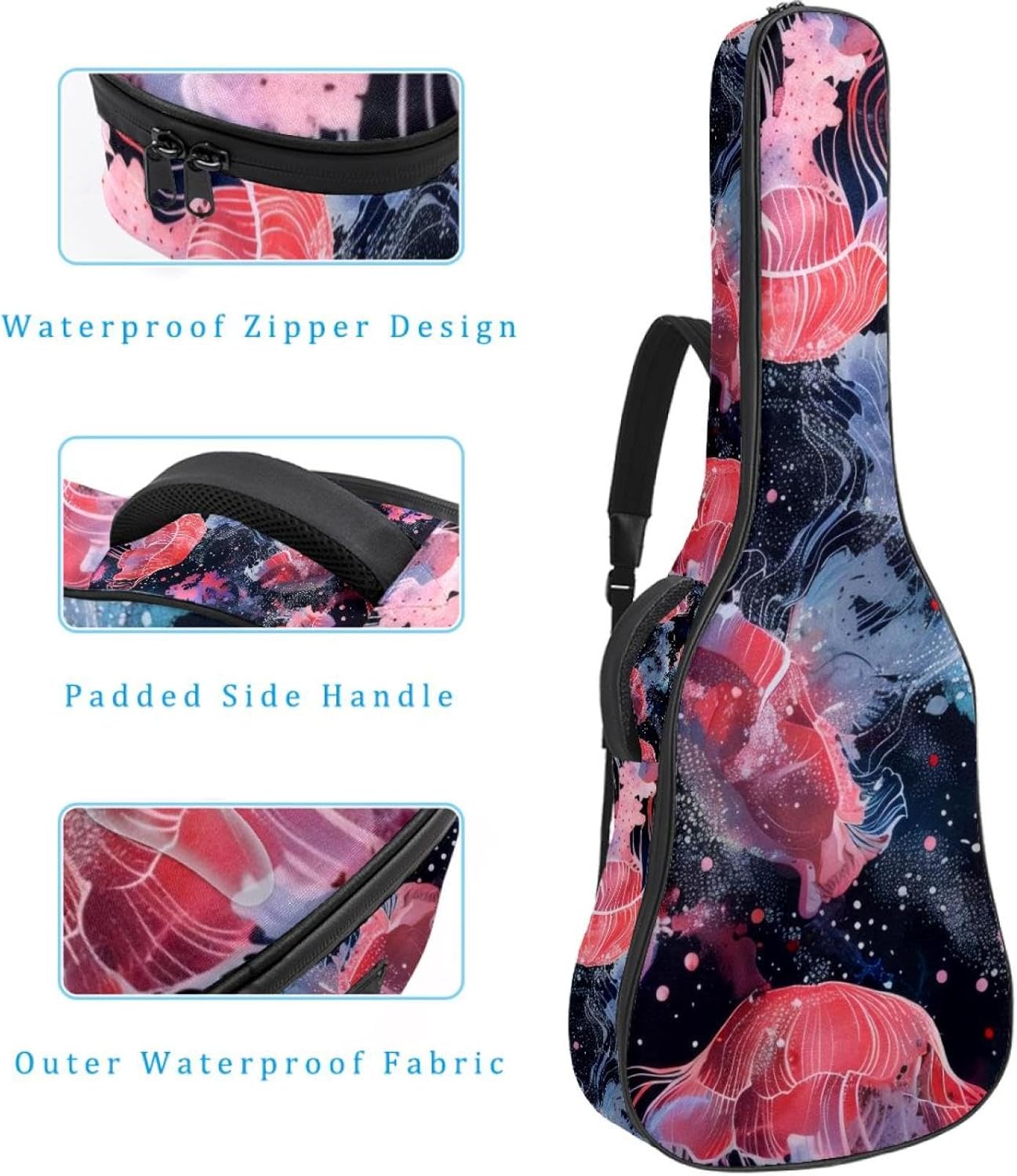 Specifications:Material: waterproof Oxford and waterproof zipper;Size: 42.9’’ x 16.9’’ x 4.7’’, perfect for 40'' 41'' 42'' guitar;Weight:36oz/1020g, lightweight;Color: Multi-color.Features:1. Adjustable backpack shoulder straps and padded side carry handle for more pleasant carrying choices.2. 10mm thick sponge padding inside provide protection for your musical instrument; and fixed Velcro above neck and body keep your acoustic guitar bag safer.3. This guitar bag comes with back hanger loop can be hung on the wall. Save more space when not in use.4. Two pockets for storage convenience, 1 large capacity pocket on outside back and 1 small pocket on the inside neck.5. Cute printed guitar gig bag guitar case backpack, ideal as a gift for your relatives or friends who love music when birthday, Thanksgiving, Christmas, holidays, and other special events.