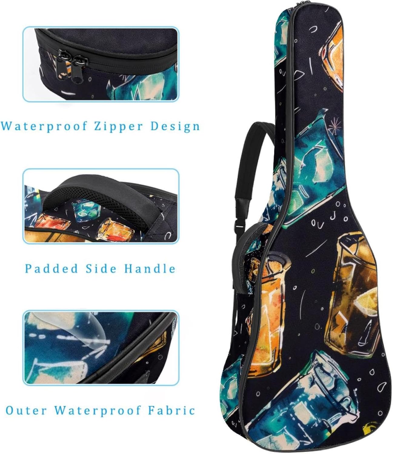 Specifications:Material: waterproof Oxford and waterproof zipper;Size: 42.9’’ x 16.9’’ x 4.7’’, perfect for 40'' 41'' 42'' guitar;Weight:36oz/1020g, lightweight;Color: Multi-color.Features:1. Adjustable backpack shoulder straps and padded side carry handle for more pleasant carrying choices.2. 10mm thick sponge padding inside provide protection for your musical instrument; and fixed Velcro above neck and body keep your acoustic guitar bag safer.3. This guitar bag comes with back hanger loop can be hung on the wall. Save more space when not in use.4. Two pockets for storage convenience, 1 large capacity pocket on outside back and 1 small pocket on the inside neck.5. Cute printed guitar gig bag guitar case backpack, ideal as a gift for your relatives or friends who love music when birthday, Thanksgiving, Christmas, holidays, and other special events.