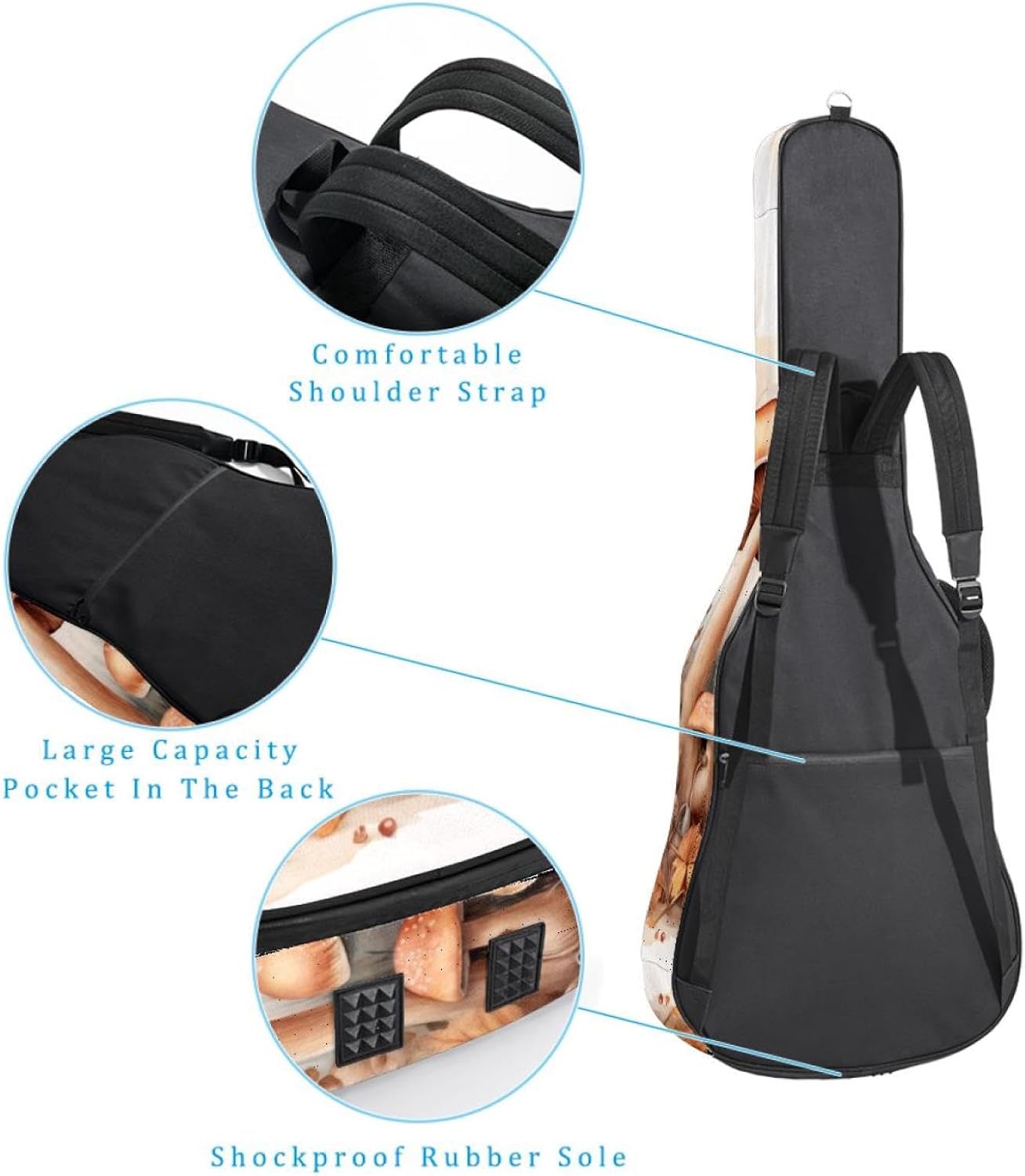 Specifications:Material: waterproof Oxford and waterproof zipper;Size: 42.9’’ x 16.9’’ x 4.7’’, perfect for 40'' 41'' 42'' guitar;Weight:36oz/1020g, lightweight;Color: Multi-color.Features:1. Adjustable backpack shoulder straps and padded side carry handle for more pleasant carrying choices.2. 10mm thick sponge padding inside provide protection for your musical instrument; and fixed Velcro above neck and body keep your acoustic guitar bag safer.3. This guitar bag comes with back hanger loop can be hung on the wall. Save more space when not in use.4. Two pockets for storage convenience, 1 large capacity pocket on outside back and 1 small pocket on the inside neck.5. Cute printed guitar gig bag guitar case backpack, ideal as a gift for your relatives or friends who love music when birthday, Thanksgiving, Christmas, holidays, and other special events.