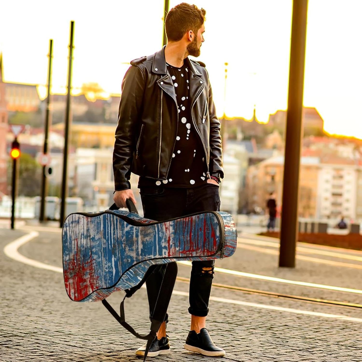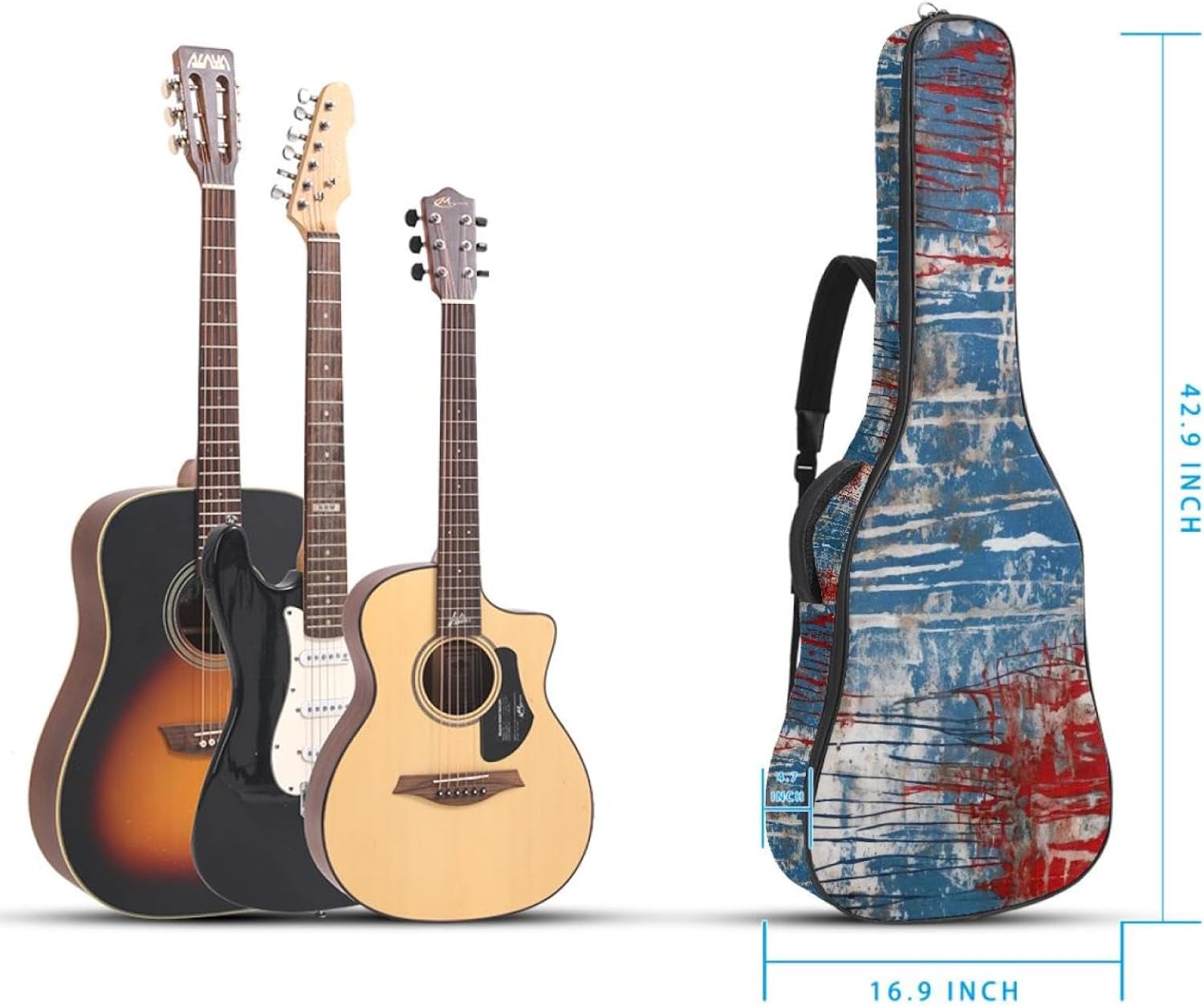 Specifications:Material: waterproof Oxford and waterproof zipper;Size: 42.9’’ x 16.9’’ x 4.7’’, perfect for 40'' 41'' 42'' guitar;Weight:36oz/1020g, lightweight;Color: Multi-color.Features:1. Adjustable backpack shoulder straps and padded side carry handle for more pleasant carrying choices.2. 10mm thick sponge padding inside provide protection for your musical instrument; and fixed Velcro above neck and body keep your acoustic guitar bag safer.3. This guitar bag comes with back hanger loop can be hung on the wall. Save more space when not in use.4. Two pockets for storage convenience, 1 large capacity pocket on outside back and 1 small pocket on the inside neck.5. Cute printed guitar gig bag guitar case backpack, ideal as a gift for your relatives or friends who love music when birthday, Thanksgiving, Christmas, holidays, and other special events.