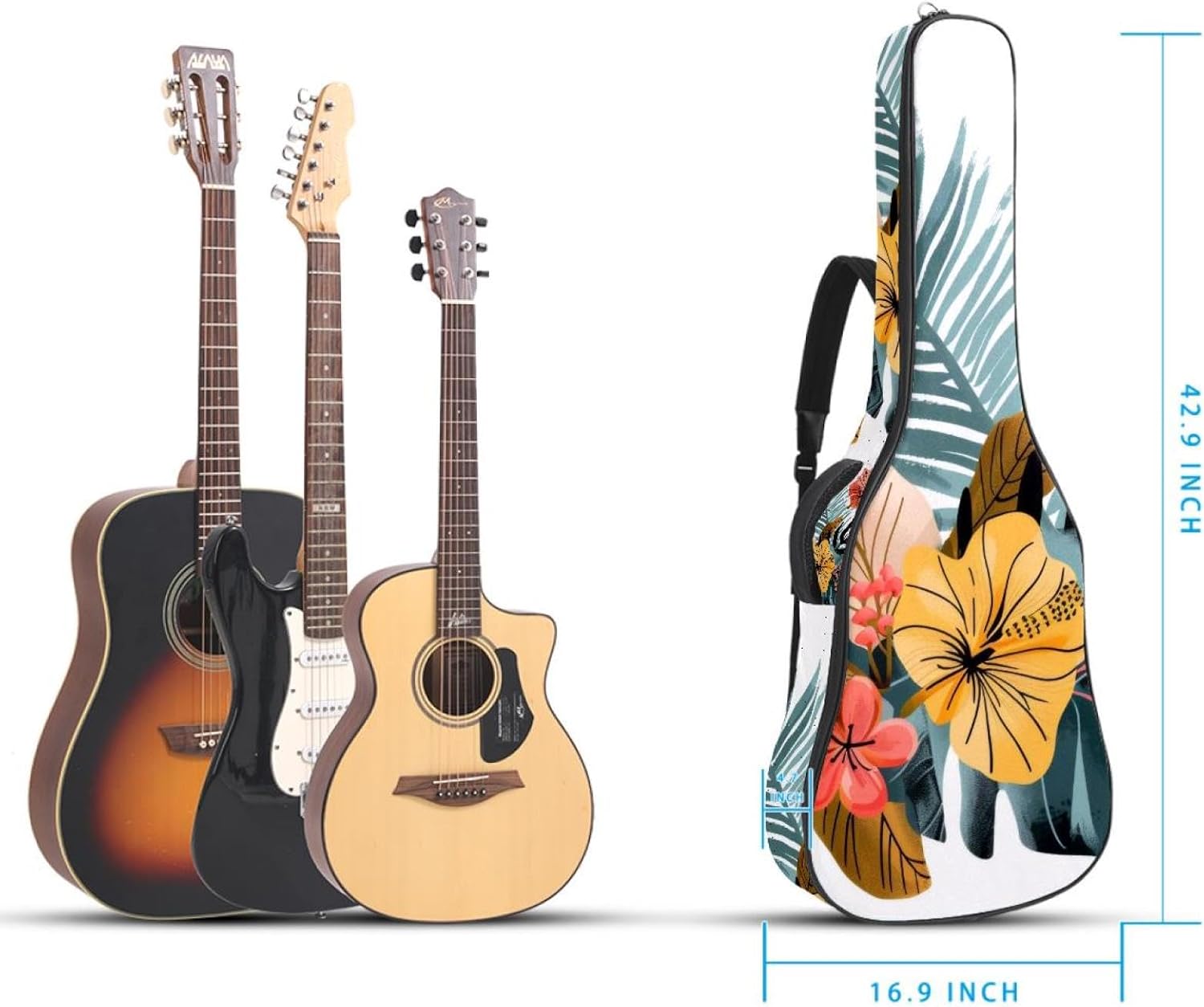 Specifications:Material: waterproof Oxford and waterproof zipper;Size: 42.9’’ x 16.9’’ x 4.7’’, perfect for 40'' 41'' 42'' guitar;Weight:36oz/1020g, lightweight;Color: Multi-color.Features:1. Adjustable backpack shoulder straps and padded side carry handle for more pleasant carrying choices.2. 10mm thick sponge padding inside provide protection for your musical instrument; and fixed Velcro above neck and body keep your acoustic guitar bag safer.3. This guitar bag comes with back hanger loop can be hung on the wall. Save more space when not in use.4. Two pockets for storage convenience, 1 large capacity pocket on outside back and 1 small pocket on the inside neck.5. Cute printed guitar gig bag guitar case backpack, ideal as a gift for your relatives or friends who love music when birthday, Thanksgiving, Christmas, holidays, and other special events.
