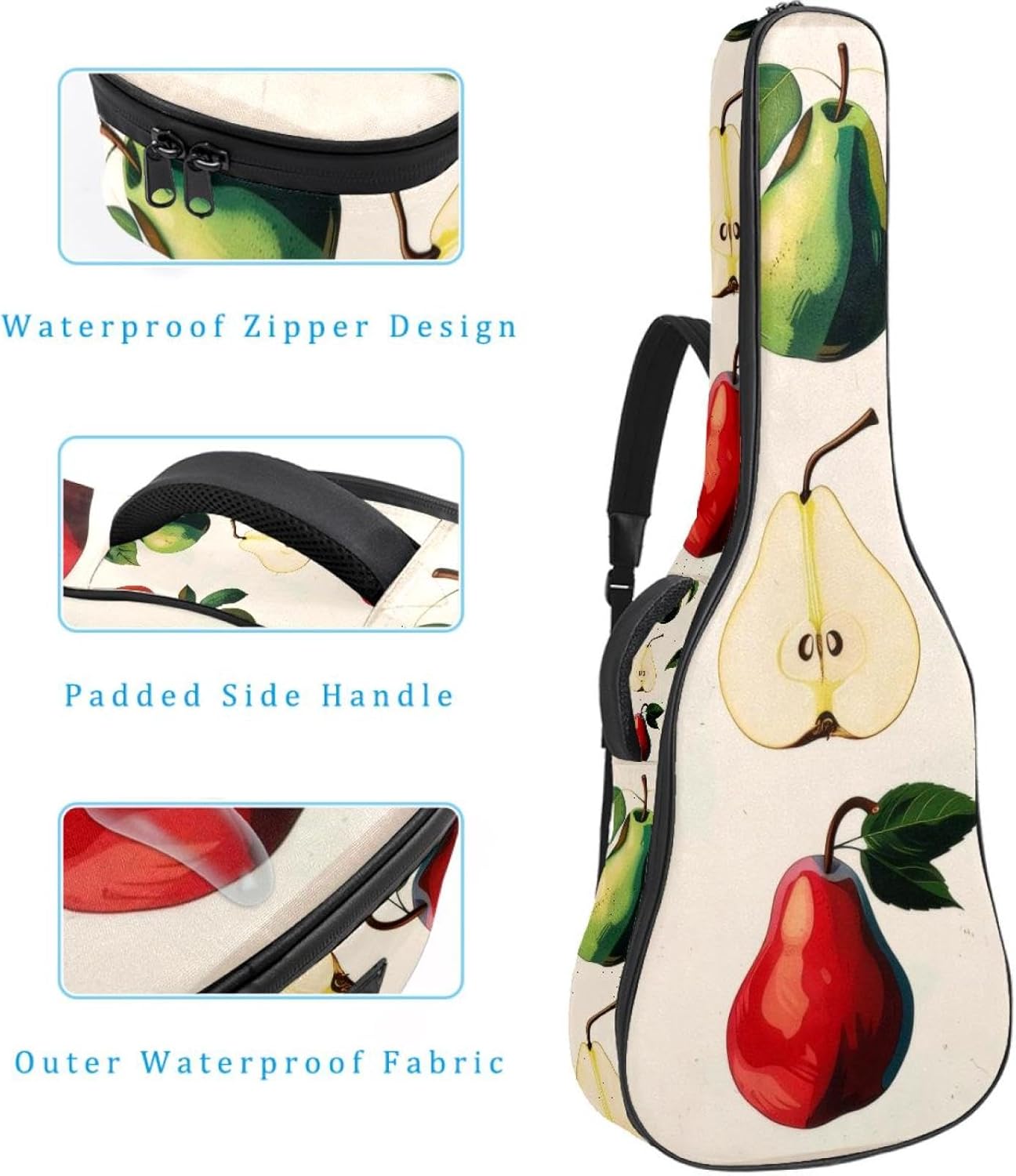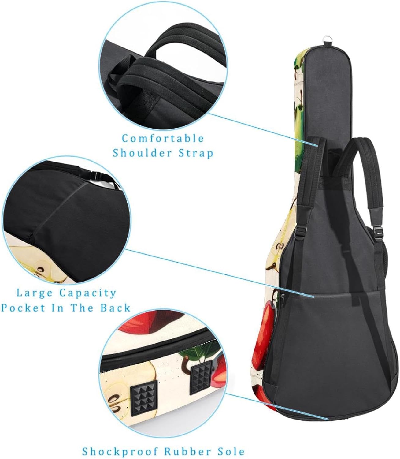 Specifications:Material: waterproof Oxford and waterproof zipper;Size: 42.9’’ x 16.9’’ x 4.7’’, perfect for 40'' 41'' 42'' guitar;Weight:36oz/1020g, lightweight;Color: Multi-color.Features:1. Adjustable backpack shoulder straps and padded side carry handle for more pleasant carrying choices.2. 10mm thick sponge padding inside provide protection for your musical instrument; and fixed Velcro above neck and body keep your acoustic guitar bag safer.3. This guitar bag comes with back hanger loop can be hung on the wall. Save more space when not in use.4. Two pockets for storage convenience, 1 large capacity pocket on outside back and 1 small pocket on the inside neck.5. Cute printed guitar gig bag guitar case backpack, ideal as a gift for your relatives or friends who love music when birthday, Thanksgiving, Christmas, holidays, and other special events.