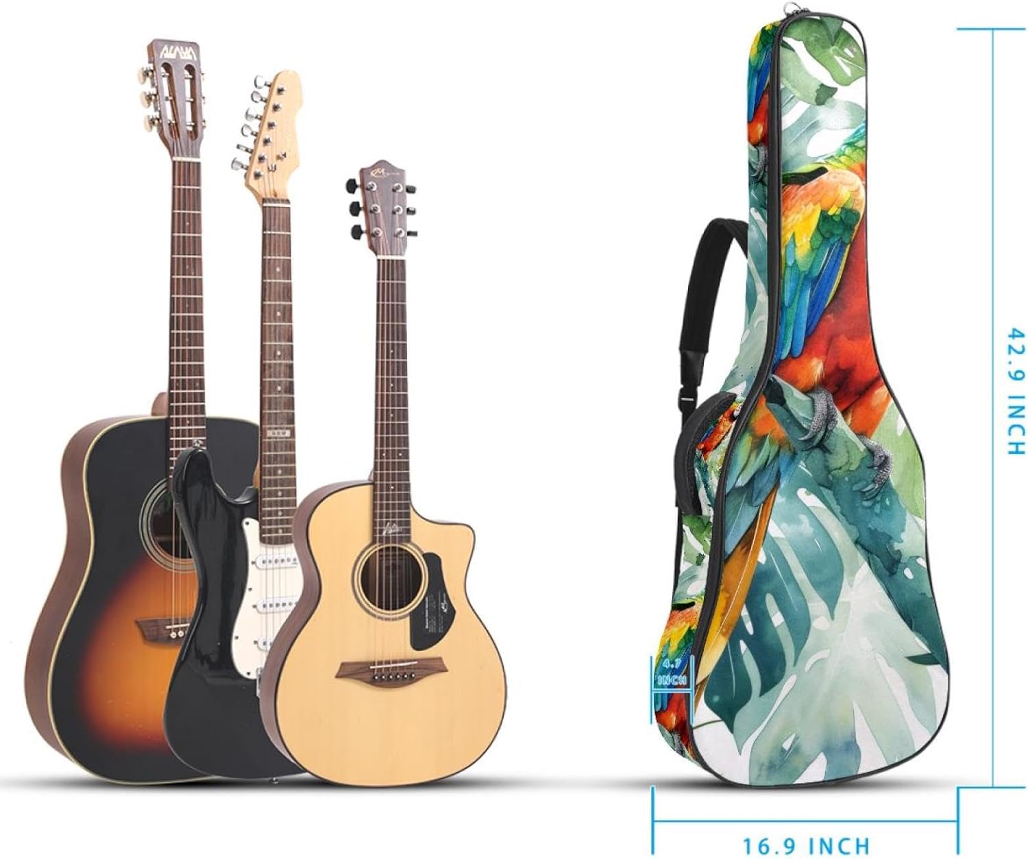 Specifications:Material: waterproof Oxford and waterproof zipper;Size: 42.9’’ x 16.9’’ x 4.7’’, perfect for 40'' 41'' 42'' guitar;Weight:36oz/1020g, lightweight;Color: Multi-color.Features:1. Adjustable backpack shoulder straps and padded side carry handle for more pleasant carrying choices.2. 10mm thick sponge padding inside provide protection for your musical instrument; and fixed Velcro above neck and body keep your acoustic guitar bag safer.3. This guitar bag comes with back hanger loop can be hung on the wall. Save more space when not in use.4. Two pockets for storage convenience, 1 large capacity pocket on outside back and 1 small pocket on the inside neck.5. Cute printed guitar gig bag guitar case backpack, ideal as a gift for your relatives or friends who love music when birthday, Thanksgiving, Christmas, holidays, and other special events.