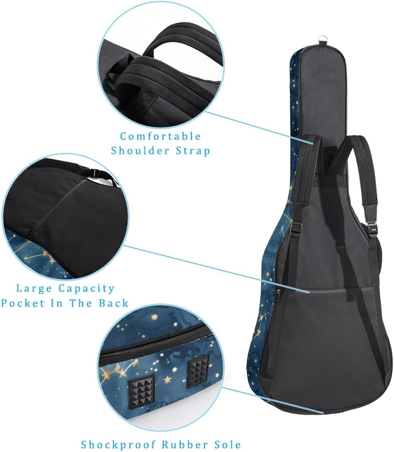 Specifications:Material: waterproof Oxford and waterproof zipper;Size: 42.9’’ x 16.9’’ x 4.7’’, perfect for 40'' 41'' 42'' guitar;Weight:36oz/1020g, lightweight;Color: Multi-color.Features:1. Adjustable backpack shoulder straps and padded side carry handle for more pleasant carrying choices.2. 10mm thick sponge padding inside provide protection for your musical instrument; and fixed Velcro above neck and body keep your acoustic guitar bag safer.3. This guitar bag comes with back hanger loop can be hung on the wall. Save more space when not in use.4. Two pockets for storage convenience, 1 large capacity pocket on outside back and 1 small pocket on the inside neck.5. Cute printed guitar gig bag guitar case backpack, ideal as a gift for your relatives or friends who love music when birthday, Thanksgiving, Christmas, holidays, and other special events.
