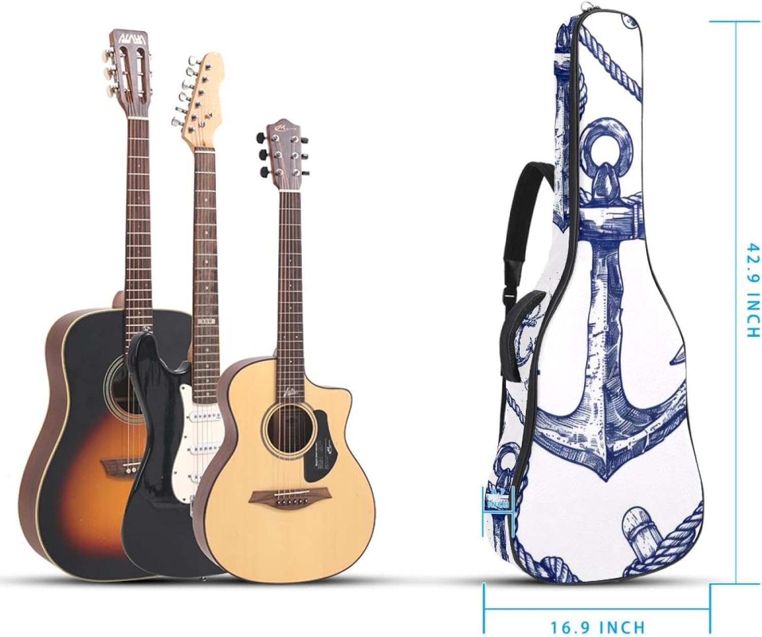 Specifications:Material: waterproof Oxford and waterproof zipper;Size: 42.9’’ x 16.9’’ x 4.7’’, perfect for 40'' 41'' 42'' guitar;Weight:36oz/1020g, lightweight;Color: Multi-color.Features:1. Adjustable backpack shoulder straps and padded side carry handle for more pleasant carrying choices.2. 10mm thick sponge padding inside provide protection for your musical instrument; and fixed Velcro above neck and body keep your acoustic guitar bag safer.3. This guitar bag comes with back hanger loop can be hung on the wall. Save more space when not in use.4. Two pockets for storage convenience, 1 large capacity pocket on outside back and 1 small pocket on the inside neck.5. Cute printed guitar gig bag guitar case backpack, ideal as a gift for your relatives or friends who love music when birthday, Thanksgiving, Christmas, holidays, and other special events.