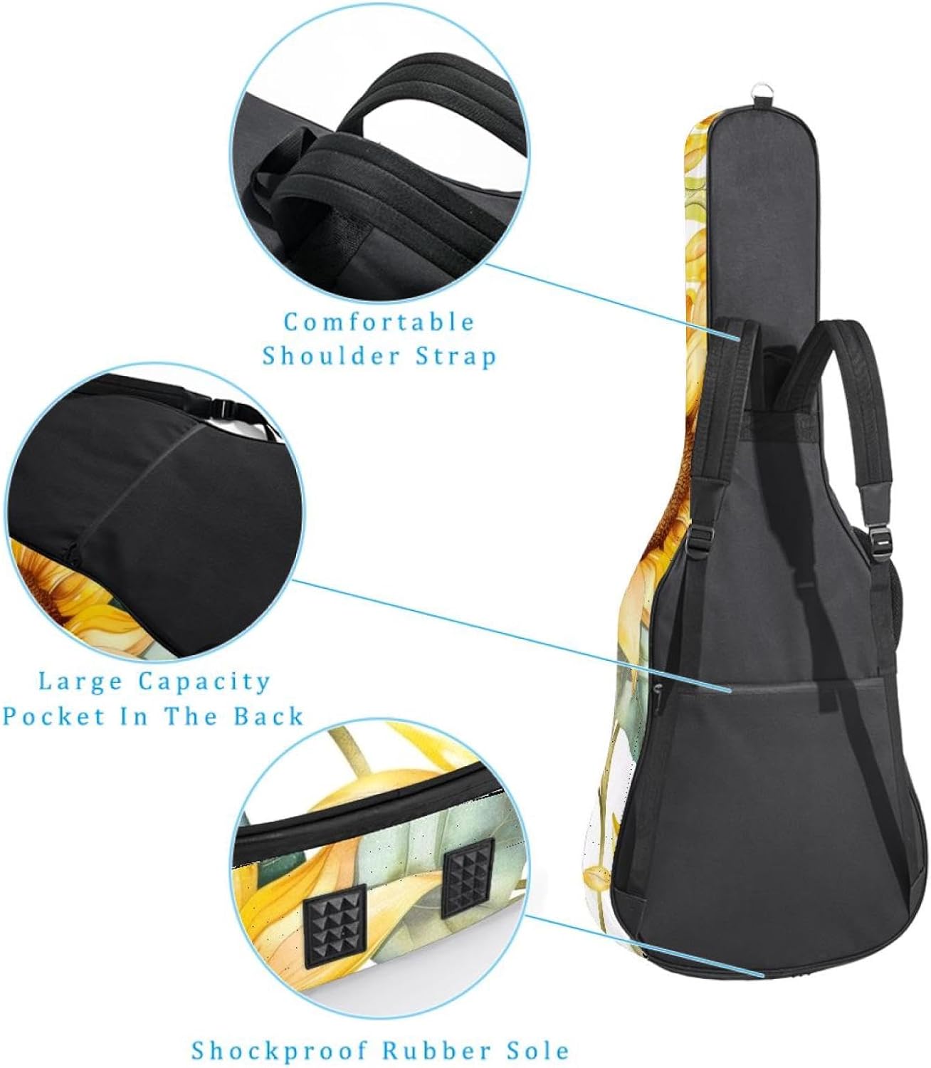 Specifications:Material: waterproof Oxford and waterproof zipper;Size: 42.9’’ x 16.9’’ x 4.7’’, perfect for 40'' 41'' 42'' guitar;Weight:36oz/1020g, lightweight;Color: Multi-color.Features:1. Adjustable backpack shoulder straps and padded side carry handle for more pleasant carrying choices.2. 10mm thick sponge padding inside provide protection for your musical instrument; and fixed Velcro above neck and body keep your acoustic guitar bag safer.3. This guitar bag comes with back hanger loop can be hung on the wall. Save more space when not in use.4. Two pockets for storage convenience, 1 large capacity pocket on outside back and 1 small pocket on the inside neck.5. Cute printed guitar gig bag guitar case backpack, ideal as a gift for your relatives or friends who love music when birthday, Thanksgiving, Christmas, holidays, and other special events.