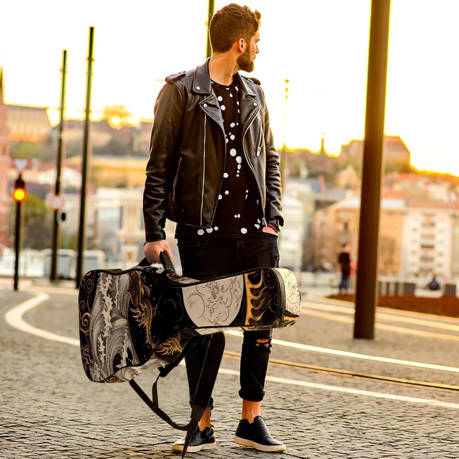 Specifications:Material: waterproof Oxford and waterproof zipper;Size: 42.9’’ x 16.9’’ x 4.7’’, perfect for 40'' 41'' 42'' guitar;Weight:36oz/1020g, lightweight;Color: Multi-color.Features:1. Adjustable backpack shoulder straps and padded side carry handle for more pleasant carrying choices.2. 10mm thick sponge padding inside provide protection for your musical instrument; and fixed Velcro above neck and body keep your acoustic guitar bag safer.3. This guitar bag comes with back hanger loop can be hung on the wall. Save more space when not in use.4. Two pockets for storage convenience, 1 large capacity pocket on outside back and 1 small pocket on the inside neck.5. Cute printed guitar gig bag guitar case backpack, ideal as a gift for your relatives or friends who love music when birthday, Thanksgiving, Christmas, holidays, and other special events.