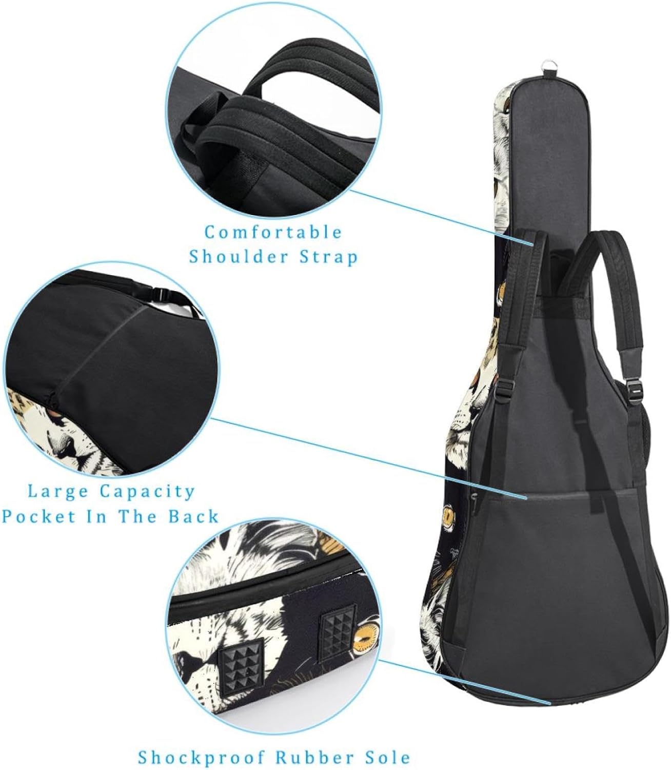 Specifications:Material: waterproof Oxford and waterproof zipper;Size: 42.9’’ x 16.9’’ x 4.7’’, perfect for 40'' 41'' 42'' guitar;Weight:36oz/1020g, lightweight;Color: Multi-color.Features:1. Adjustable backpack shoulder straps and padded side carry handle for more pleasant carrying choices.2. 10mm thick sponge padding inside provide protection for your musical instrument; and fixed Velcro above neck and body keep your acoustic guitar bag safer.3. This guitar bag comes with back hanger loop can be hung on the wall. Save more space when not in use.4. Two pockets for storage convenience, 1 large capacity pocket on outside back and 1 small pocket on the inside neck.5. Cute printed guitar gig bag guitar case backpack, ideal as a gift for your relatives or friends who love music when birthday, Thanksgiving, Christmas, holidays, and other special events.