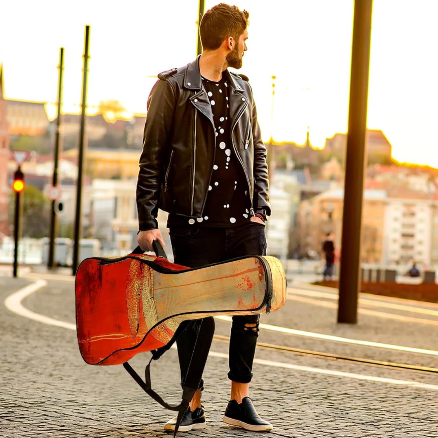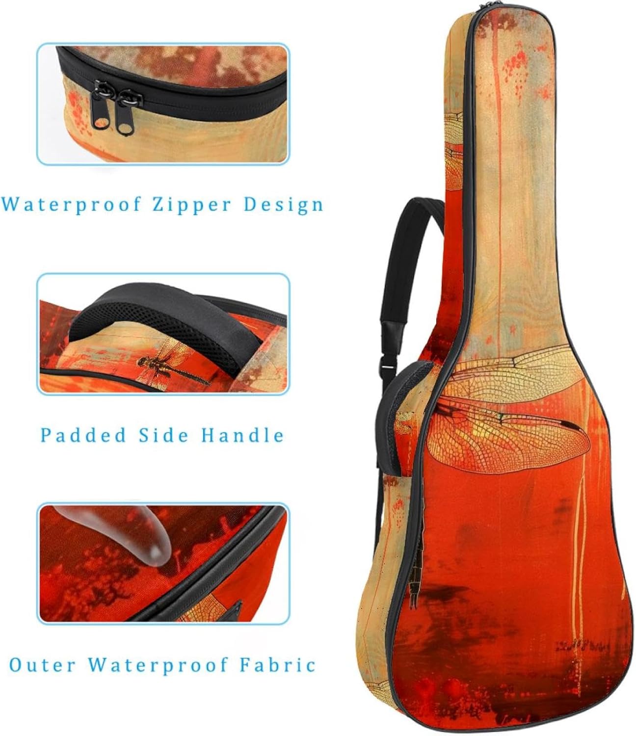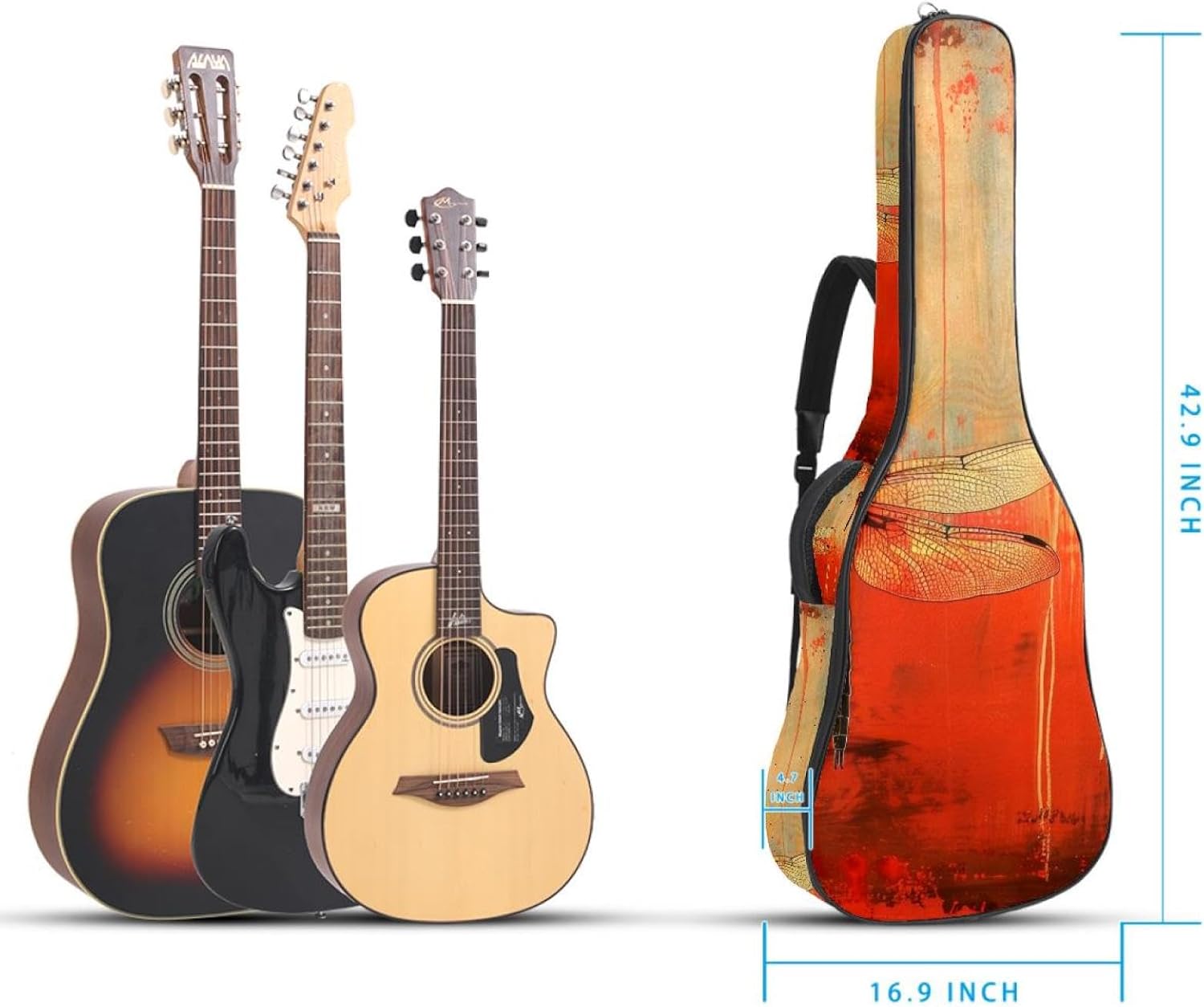 Specifications:Material: waterproof Oxford and waterproof zipper;Size: 42.9’’ x 16.9’’ x 4.7’’, perfect for 40'' 41'' 42'' guitar;Weight:36oz/1020g, lightweight;Color: Multi-color.Features:1. Adjustable backpack shoulder straps and padded side carry handle for more pleasant carrying choices.2. 10mm thick sponge padding inside provide protection for your musical instrument; and fixed Velcro above neck and body keep your acoustic guitar bag safer.3. This guitar bag comes with back hanger loop can be hung on the wall. Save more space when not in use.4. Two pockets for storage convenience, 1 large capacity pocket on outside back and 1 small pocket on the inside neck.5. Cute printed guitar gig bag guitar case backpack, ideal as a gift for your relatives or friends who love music when birthday, Thanksgiving, Christmas, holidays, and other special events.