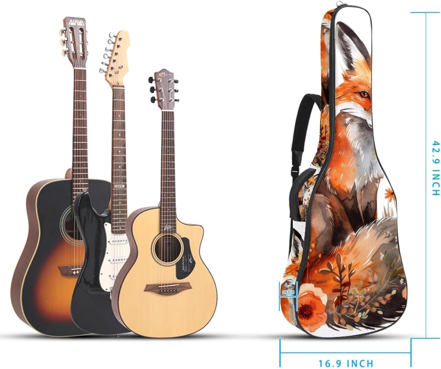 Specifications:Material: waterproof Oxford and waterproof zipper;Size: 42.9’’ x 16.9’’ x 4.7’’, perfect for 40'' 41'' 42'' guitar;Weight:36oz/1020g, lightweight;Color: Multi-color.Features:1. Adjustable backpack shoulder straps and padded side carry handle for more pleasant carrying choices.2. 10mm thick sponge padding inside provide protection for your musical instrument; and fixed Velcro above neck and body keep your acoustic guitar bag safer.3. This guitar bag comes with back hanger loop can be hung on the wall. Save more space when not in use.4. Two pockets for storage convenience, 1 large capacity pocket on outside back and 1 small pocket on the inside neck.5. Cute printed guitar gig bag guitar case backpack, ideal as a gift for your relatives or friends who love music when birthday, Thanksgiving, Christmas, holidays, and other special events.