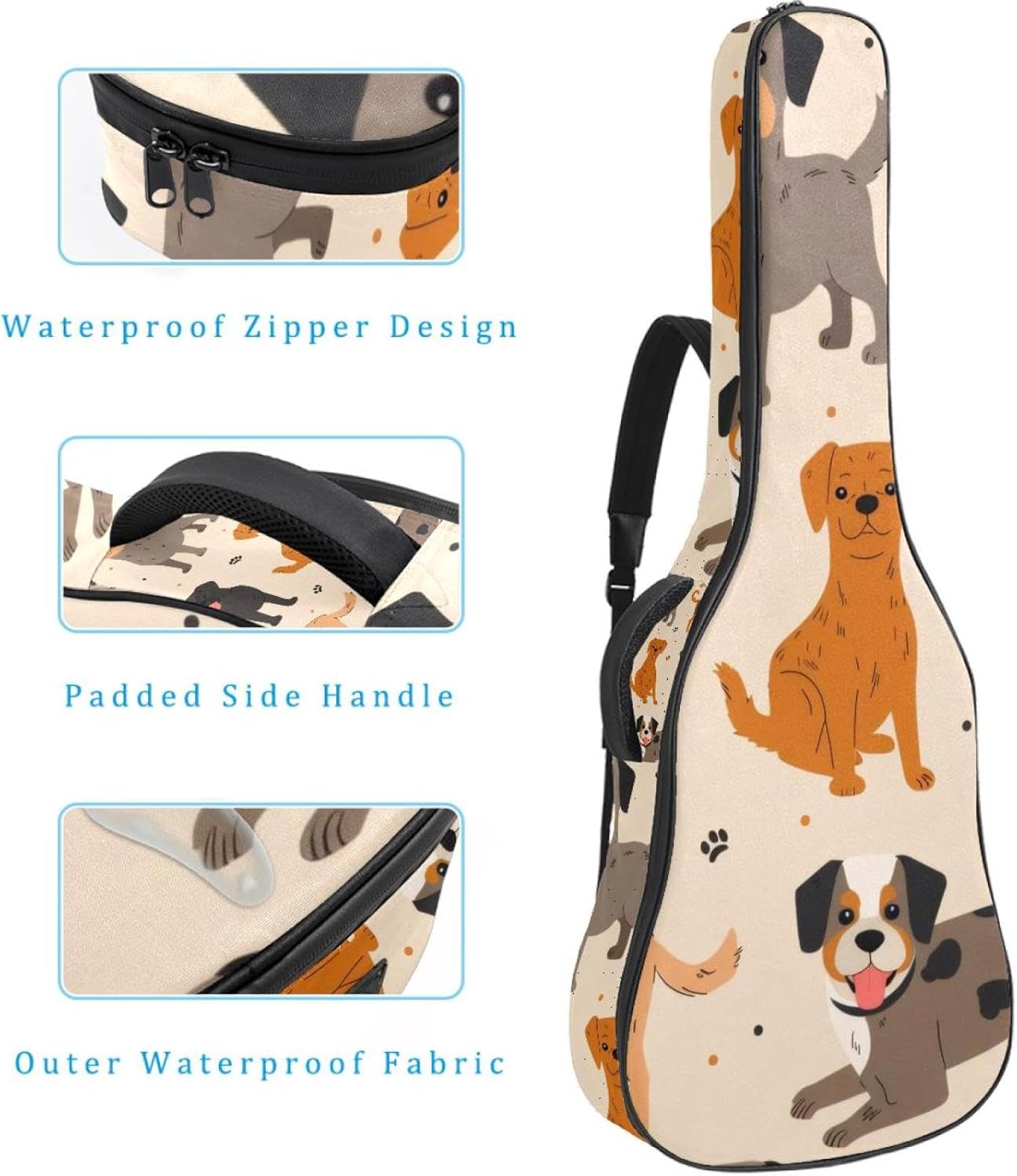 Specifications:Material: waterproof Oxford and waterproof zipper;Size: 42.9’’ x 16.9’’ x 4.7’’, perfect for 40'' 41'' 42'' guitar;Weight:36oz/1020g, lightweight;Color: Multi-color.Features:1. Adjustable backpack shoulder straps and padded side carry handle for more pleasant carrying choices.2. 10mm thick sponge padding inside provide protection for your musical instrument; and fixed Velcro above neck and body keep your acoustic guitar bag safer.3. This guitar bag comes with back hanger loop can be hung on the wall. Save more space when not in use.4. Two pockets for storage convenience, 1 large capacity pocket on outside back and 1 small pocket on the inside neck.5. Cute printed guitar gig bag guitar case backpack, ideal as a gift for your relatives or friends who love music when birthday, Thanksgiving, Christmas, holidays, and other special events.