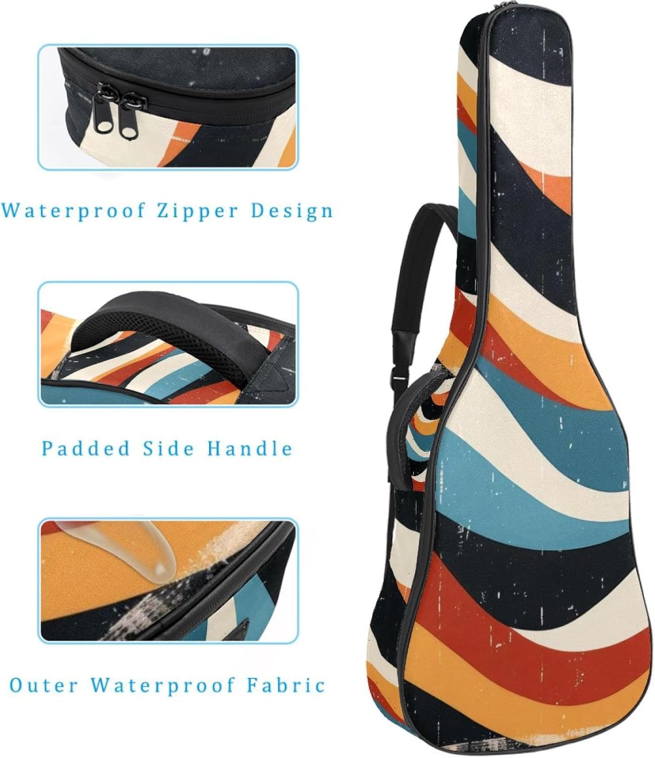 Specifications:Material: waterproof Oxford and waterproof zipper;Size: 42.9’’ x 16.9’’ x 4.7’’, perfect for 40'' 41'' 42'' guitar;Weight:36oz/1020g, lightweight;Color: Multi-color.Features:1. Adjustable backpack shoulder straps and padded side carry handle for more pleasant carrying choices.2. 10mm thick sponge padding inside provide protection for your musical instrument; and fixed Velcro above neck and body keep your acoustic guitar bag safer.3. This guitar bag comes with back hanger loop can be hung on the wall. Save more space when not in use.4. Two pockets for storage convenience, 1 large capacity pocket on outside back and 1 small pocket on the inside neck.5. Cute printed guitar gig bag guitar case backpack, ideal as a gift for your relatives or friends who love music when birthday, Thanksgiving, Christmas, holidays, and other special events.