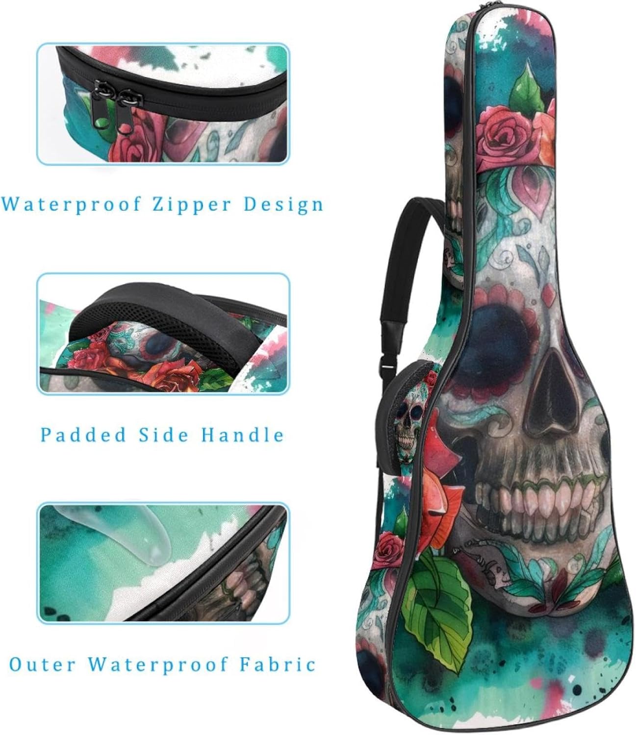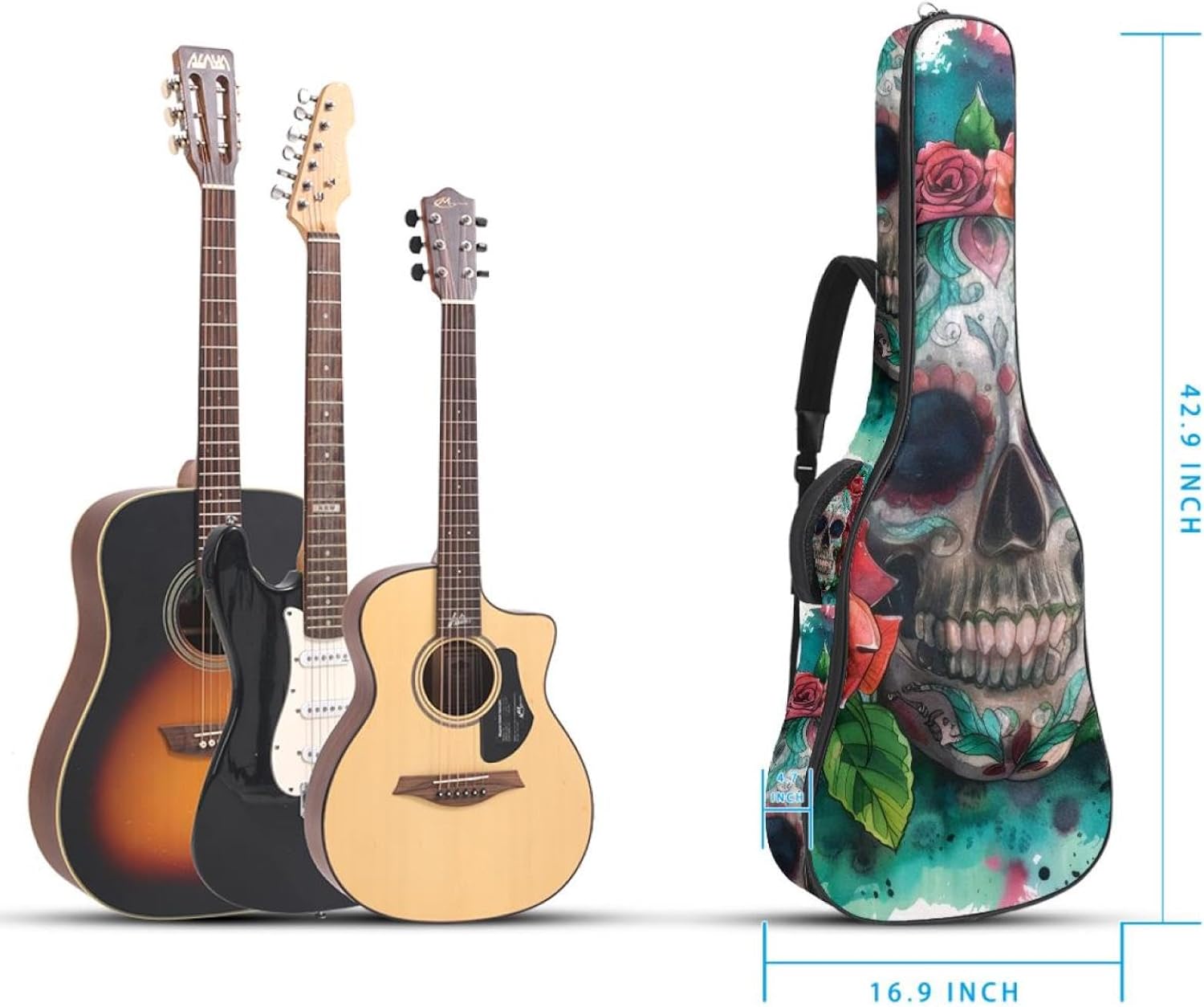Specifications:Material: waterproof Oxford and waterproof zipper;Size: 42.9’’ x 16.9’’ x 4.7’’, perfect for 40'' 41'' 42'' guitar;Weight:36oz/1020g, lightweight;Color: Multi-color.Features:1. Adjustable backpack shoulder straps and padded side carry handle for more pleasant carrying choices.2. 10mm thick sponge padding inside provide protection for your musical instrument; and fixed Velcro above neck and body keep your acoustic guitar bag safer.3. This guitar bag comes with back hanger loop can be hung on the wall. Save more space when not in use.4. Two pockets for storage convenience, 1 large capacity pocket on outside back and 1 small pocket on the inside neck.5. Cute printed guitar gig bag guitar case backpack, ideal as a gift for your relatives or friends who love music when birthday, Thanksgiving, Christmas, holidays, and other special events.