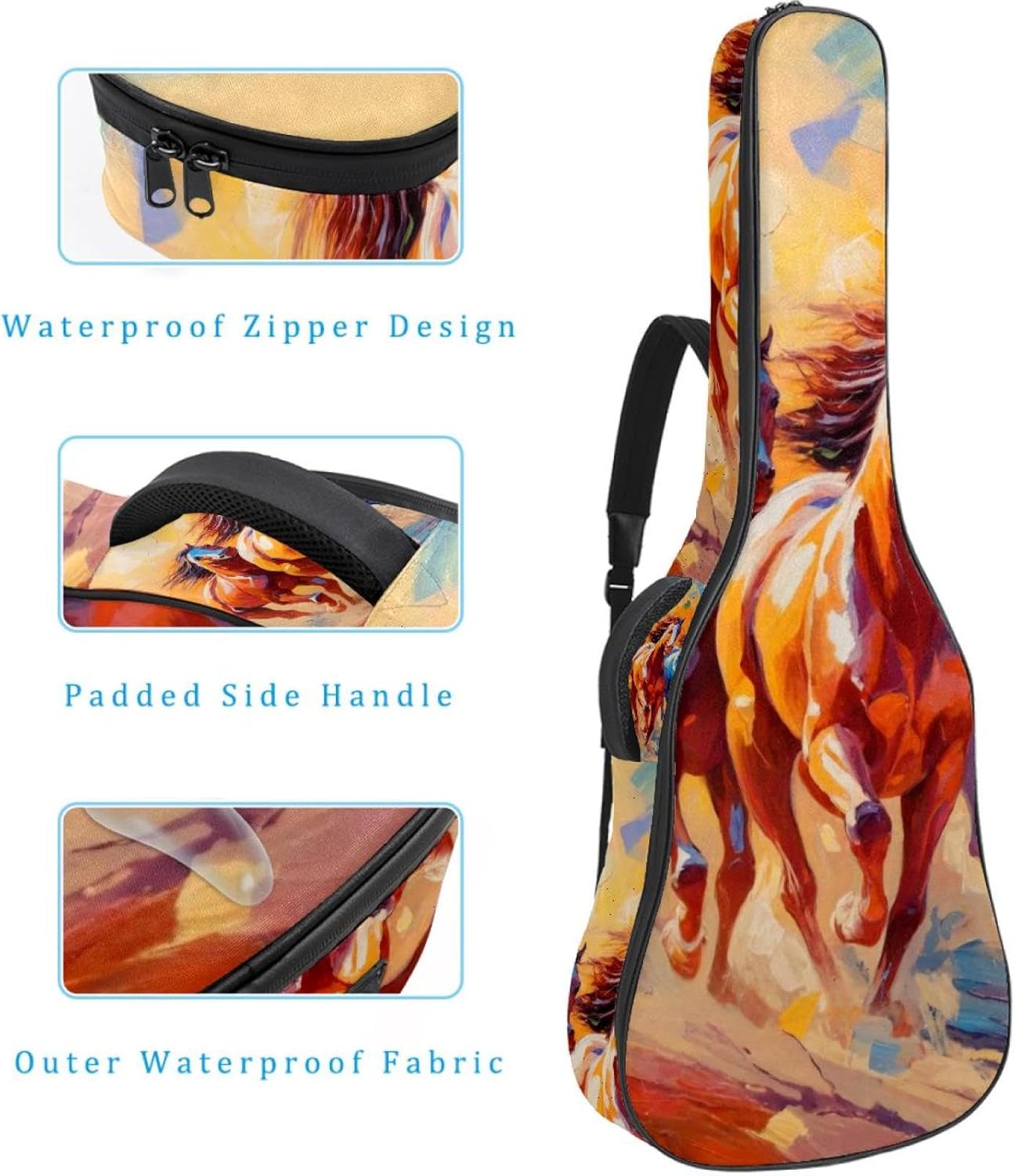 Specifications:Material: waterproof Oxford and waterproof zipper;Size: 42.9’’ x 16.9’’ x 4.7’’, perfect for 40'' 41'' 42'' guitar;Weight:36oz/1020g, lightweight;Color: Multi-color.Features:1. Adjustable backpack shoulder straps and padded side carry handle for more pleasant carrying choices.2. 10mm thick sponge padding inside provide protection for your musical instrument; and fixed Velcro above neck and body keep your acoustic guitar bag safer.3. This guitar bag comes with back hanger loop can be hung on the wall. Save more space when not in use.4. Two pockets for storage convenience, 1 large capacity pocket on outside back and 1 small pocket on the inside neck.5. Cute printed guitar gig bag guitar case backpack, ideal as a gift for your relatives or friends who love music when birthday, Thanksgiving, Christmas, holidays, and other special events.