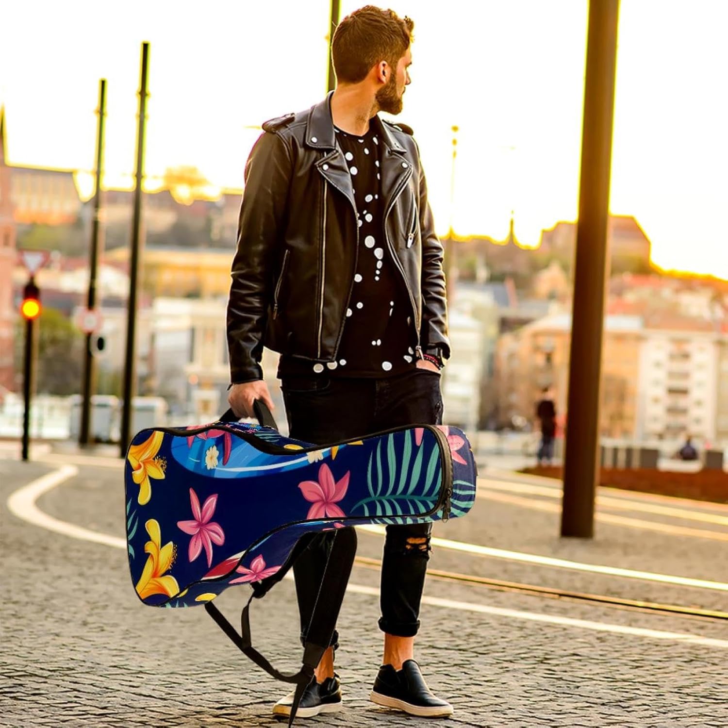 Specifications:Material: waterproof Oxford and waterproof zipper;Size: 42.9’’ x 16.9’’ x 4.7’’, perfect for 40'' 41'' 42'' guitar;Weight:36oz/1020g, lightweight;Color: Multi-color.Features:1. Adjustable backpack shoulder straps and padded side carry handle for more pleasant carrying choices.2. 10mm thick sponge padding inside provide protection for your musical instrument; and fixed Velcro above neck and body keep your acoustic guitar bag safer.3. This guitar bag comes with back hanger loop can be hung on the wall. Save more space when not in use.4. Two pockets for storage convenience, 1 large capacity pocket on outside back and 1 small pocket on the inside neck.5. Cute printed guitar gig bag guitar case backpack, ideal as a gift for your relatives or friends who love music when birthday, Thanksgiving, Christmas, holidays, and other special events.