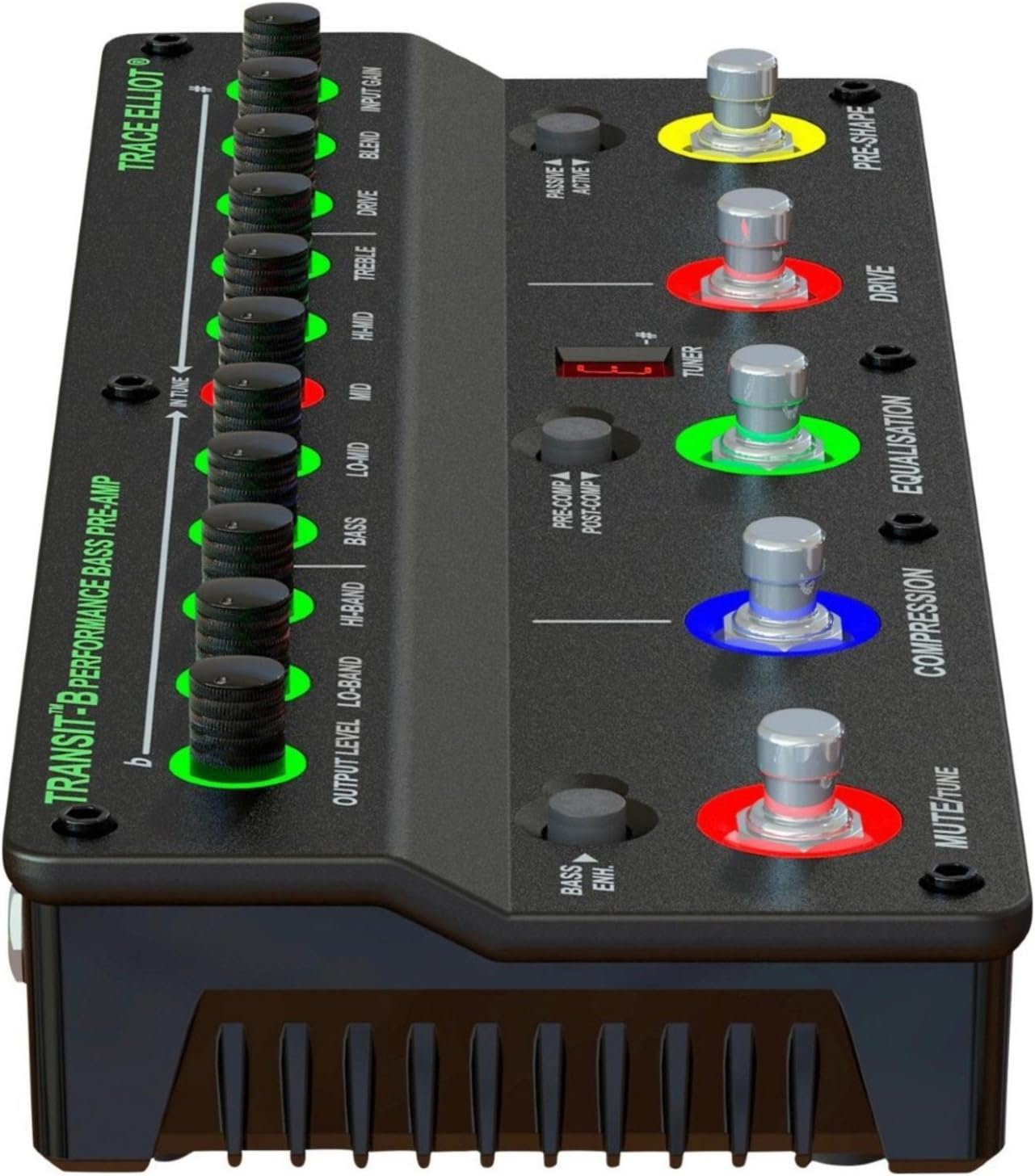 The Transit B pedal is a professional grade preamp for the discerning bassist. Built-in tools for tone shaping like Pre-shape, 5 band semi-parametric EQ and dual band Compressor are easy to use and easy to tweak on the fly. Features like Drive with blend control and built-in bass enhancement add to the tonal options available. The back-lit control panel becomes the chromatic tuner for accurate tuning. Built-in Pre and Post XLR balanced output, dry output and headphone output give the user the ins and outs they need.
