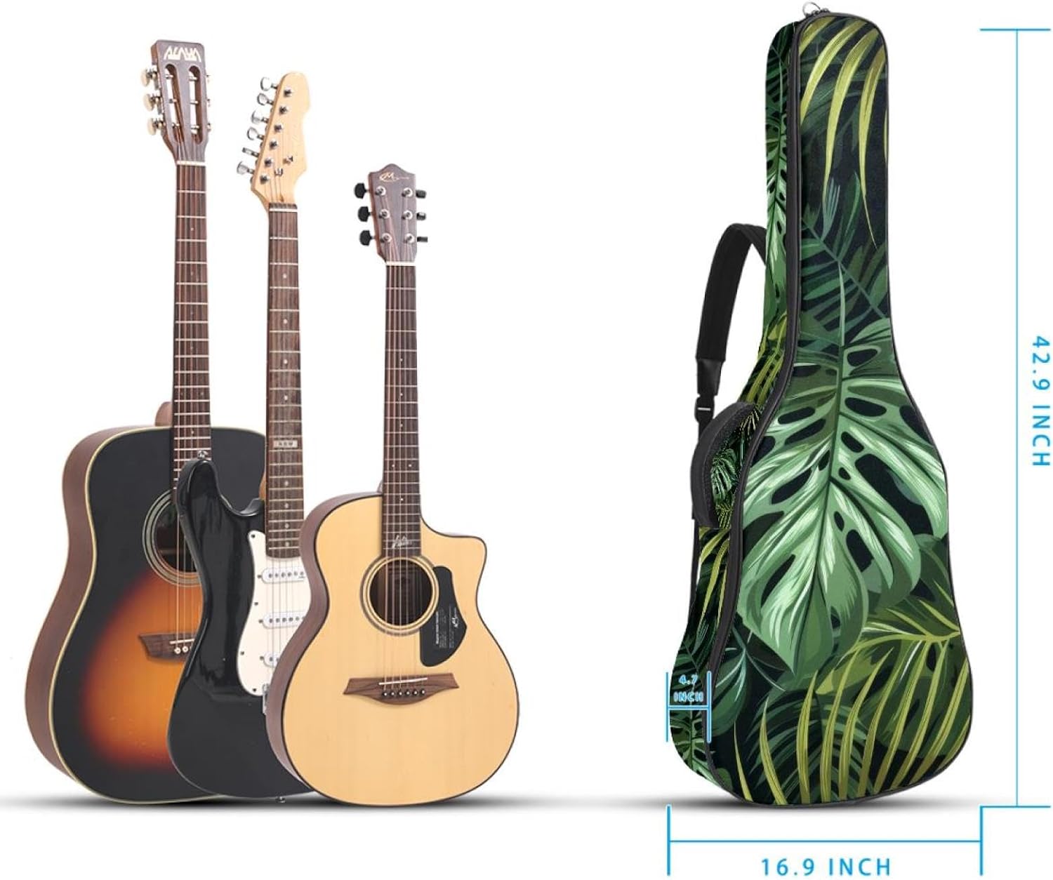 Specifications:Material: waterproof Oxford and waterproof zipper;Size: 42.9’’ x 16.9’’ x 4.7’’, perfect for 40'' 41'' 42'' guitar;Weight:36oz/1020g, lightweight;Color: Multi-color.Features:1. Adjustable backpack shoulder straps and padded side carry handle for more pleasant carrying choices.2. 10mm thick sponge padding inside provide protection for your musical instrument; and fixed Velcro above neck and body keep your acoustic guitar bag safer.3. This guitar bag comes with back hanger loop can be hung on the wall. Save more space when not in use.4. Two pockets for storage convenience, 1 large capacity pocket on outside back and 1 small pocket on the inside neck.5. Cute printed guitar gig bag guitar case backpack, ideal as a gift for your relatives or friends who love music when birthday, Thanksgiving, Christmas, holidays, and other special events.