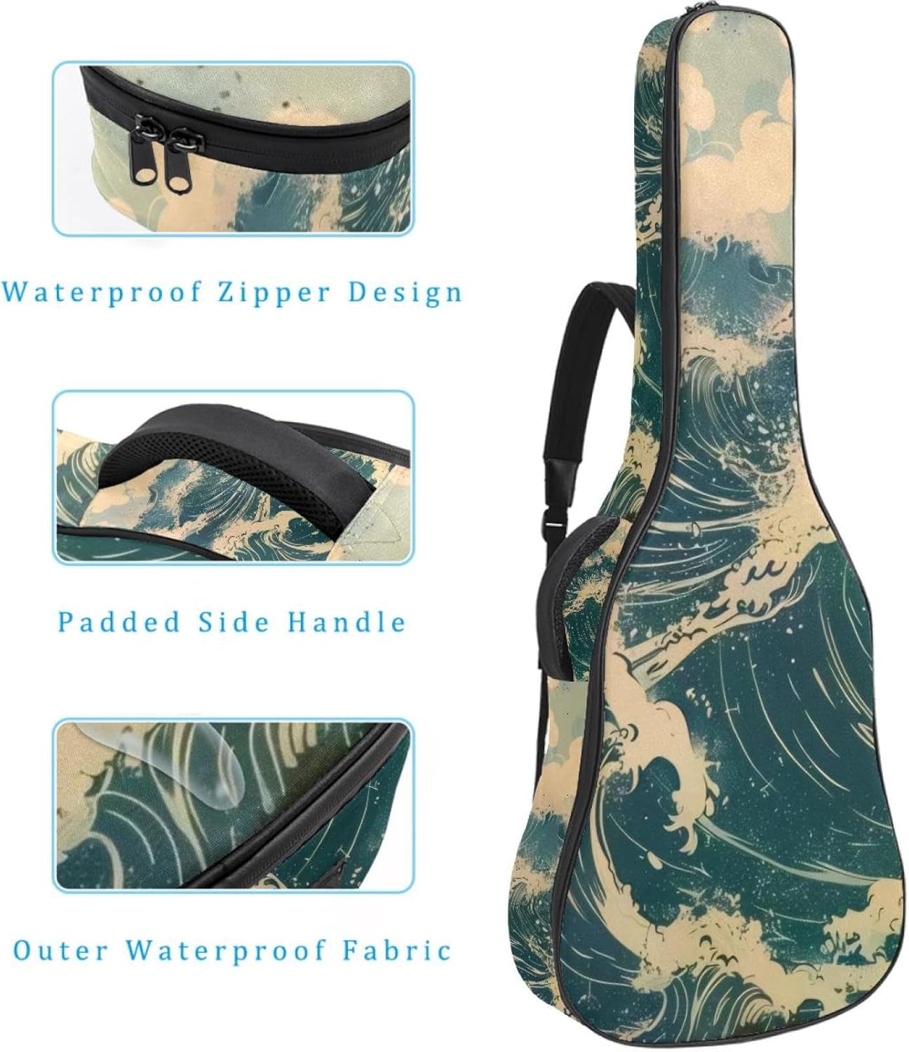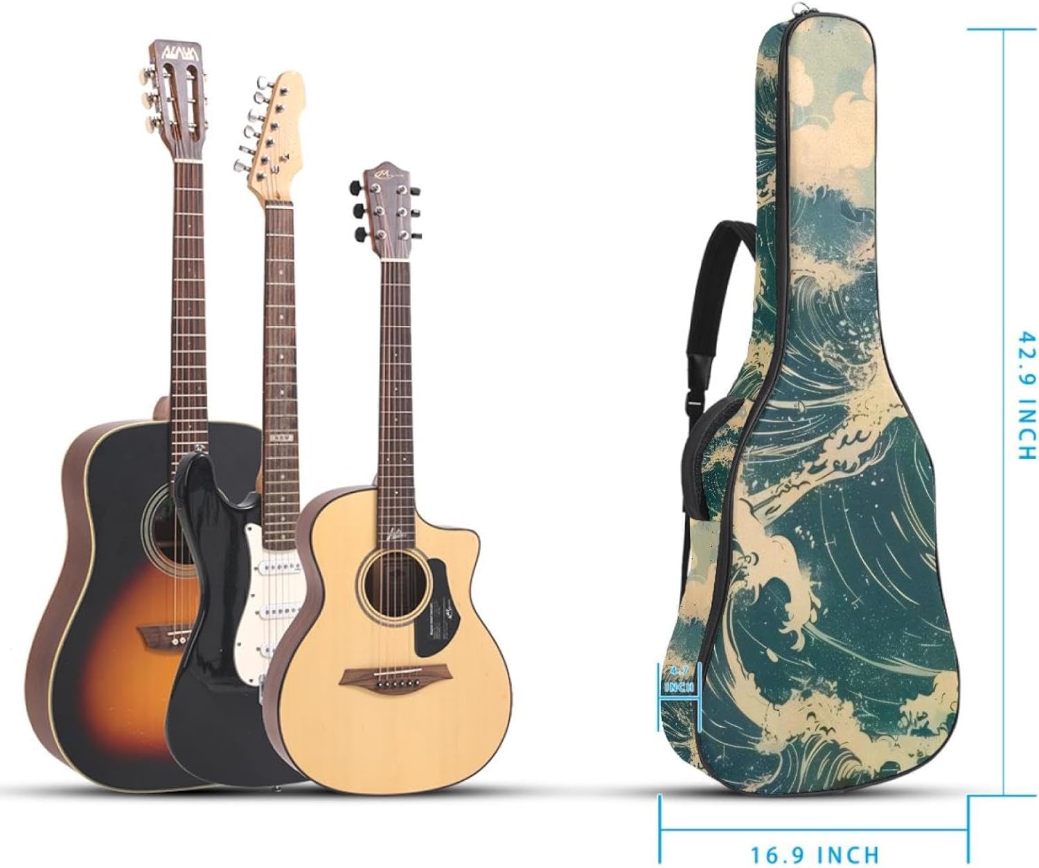 Specifications:Material: waterproof Oxford and waterproof zipper;Size: 42.9’’ x 16.9’’ x 4.7’’, perfect for 40'' 41'' 42'' guitar;Weight:36oz/1020g, lightweight;Color: Multi-color.Features:1. Adjustable backpack shoulder straps and padded side carry handle for more pleasant carrying choices.2. 10mm thick sponge padding inside provide protection for your musical instrument; and fixed Velcro above neck and body keep your acoustic guitar bag safer.3. This guitar bag comes with back hanger loop can be hung on the wall. Save more space when not in use.4. Two pockets for storage convenience, 1 large capacity pocket on outside back and 1 small pocket on the inside neck.5. Cute printed guitar gig bag guitar case backpack, ideal as a gift for your relatives or friends who love music when birthday, Thanksgiving, Christmas, holidays, and other special events.