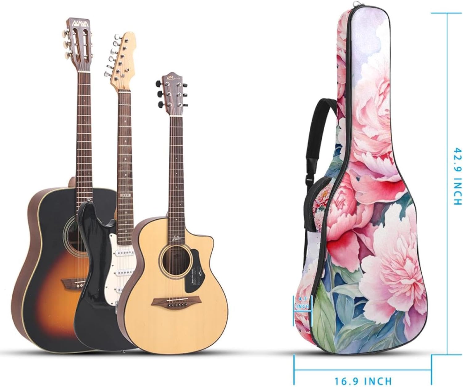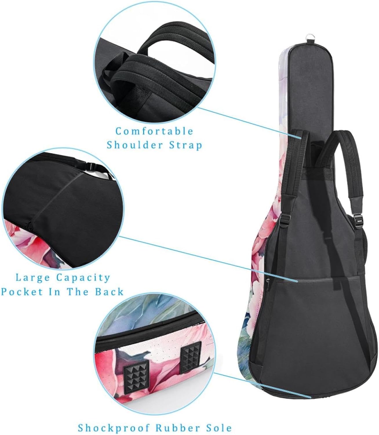 Specifications:Material: waterproof Oxford and waterproof zipper;Size: 42.9’’ x 16.9’’ x 4.7’’, perfect for 40'' 41'' 42'' guitar;Weight:36oz/1020g, lightweight;Color: Multi-color.Features:1. Adjustable backpack shoulder straps and padded side carry handle for more pleasant carrying choices.2. 10mm thick sponge padding inside provide protection for your musical instrument; and fixed Velcro above neck and body keep your acoustic guitar bag safer.3. This guitar bag comes with back hanger loop can be hung on the wall. Save more space when not in use.4. Two pockets for storage convenience, 1 large capacity pocket on outside back and 1 small pocket on the inside neck.5. Cute printed guitar gig bag guitar case backpack, ideal as a gift for your relatives or friends who love music when birthday, Thanksgiving, Christmas, holidays, and other special events.