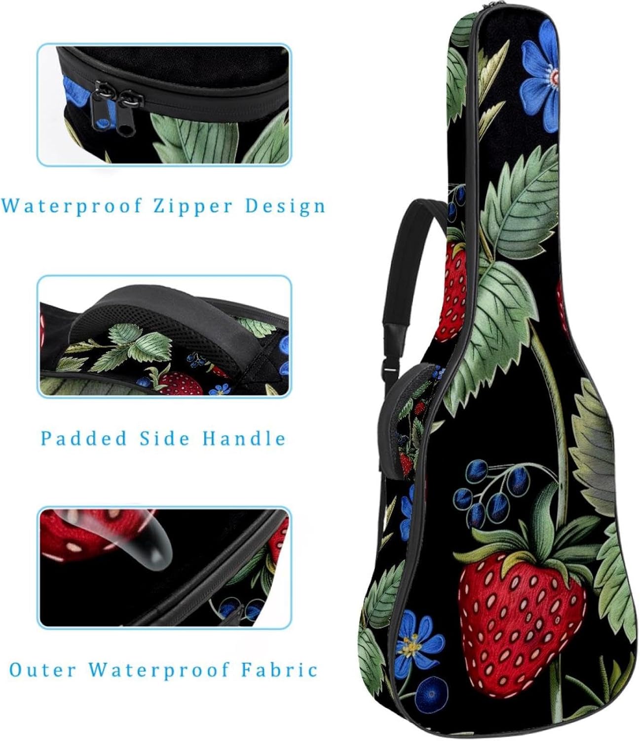 Specifications:Material: waterproof Oxford and waterproof zipper;Size: 42.9’’ x 16.9’’ x 4.7’’, perfect for 40'' 41'' 42'' guitar;Weight:36oz/1020g, lightweight;Color: Multi-color.Features:1. Adjustable backpack shoulder straps and padded side carry handle for more pleasant carrying choices.2. 10mm thick sponge padding inside provide protection for your musical instrument; and fixed Velcro above neck and body keep your acoustic guitar bag safer.3. This guitar bag comes with back hanger loop can be hung on the wall. Save more space when not in use.4. Two pockets for storage convenience, 1 large capacity pocket on outside back and 1 small pocket on the inside neck.5. Cute printed guitar gig bag guitar case backpack, ideal as a gift for your relatives or friends who love music when birthday, Thanksgiving, Christmas, holidays, and other special events.