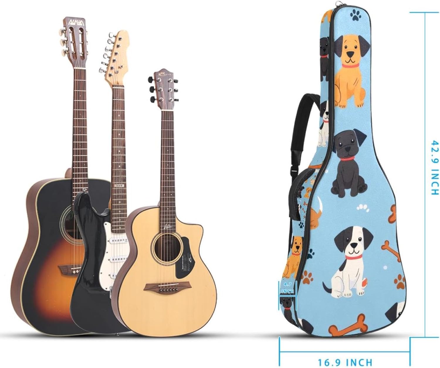 Specifications:Material: waterproof Oxford and waterproof zipper;Size: 42.9’’ x 16.9’’ x 4.7’’, perfect for 40'' 41'' 42'' guitar;Weight:36oz/1020g, lightweight;Color: Multi-color.Features:1. Adjustable backpack shoulder straps and padded side carry handle for more pleasant carrying choices.2. 10mm thick sponge padding inside provide protection for your musical instrument; and fixed Velcro above neck and body keep your acoustic guitar bag safer.3. This guitar bag comes with back hanger loop can be hung on the wall. Save more space when not in use.4. Two pockets for storage convenience, 1 large capacity pocket on outside back and 1 small pocket on the inside neck.5. Cute printed guitar gig bag guitar case backpack, ideal as a gift for your relatives or friends who love music when birthday, Thanksgiving, Christmas, holidays, and other special events.