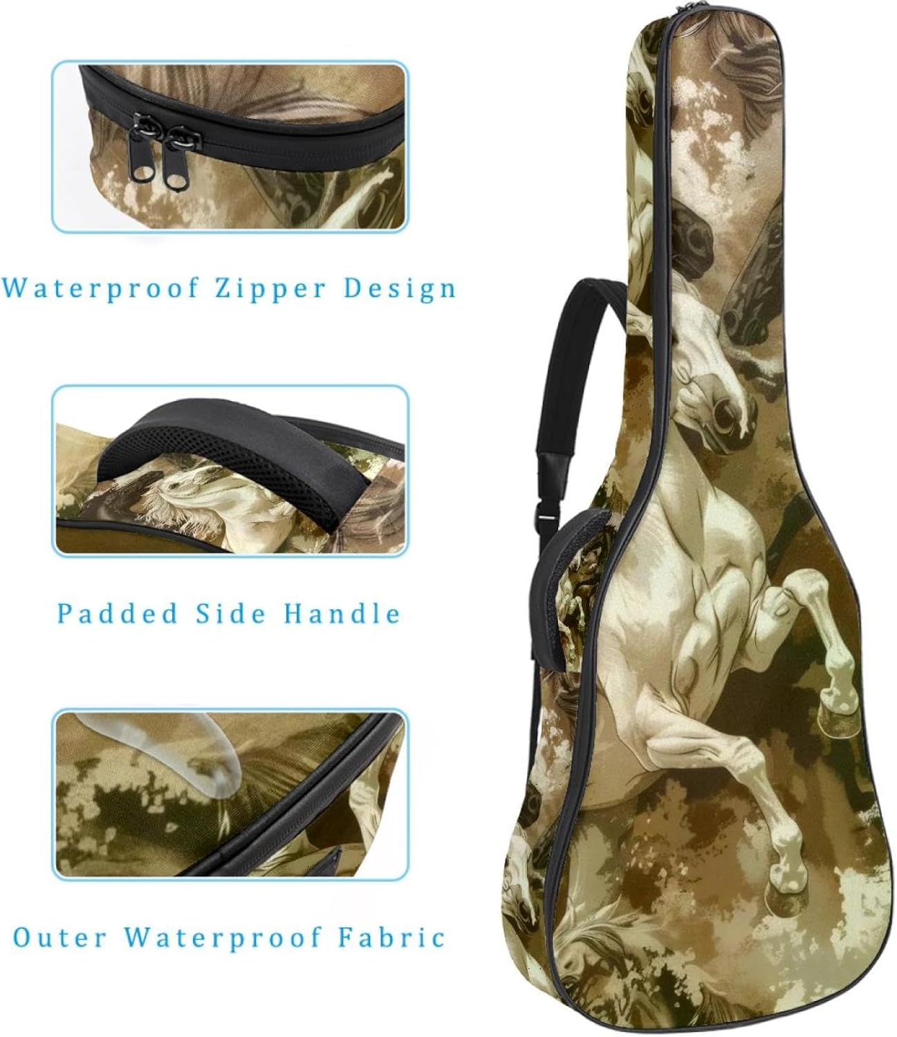 Specifications:Material: waterproof Oxford and waterproof zipper;Size: 42.9’’ x 16.9’’ x 4.7’’, perfect for 40'' 41'' 42'' guitar;Weight:36oz/1020g, lightweight;Color: Multi-color.Features:1. Adjustable backpack shoulder straps and padded side carry handle for more pleasant carrying choices.2. 10mm thick sponge padding inside provide protection for your musical instrument; and fixed Velcro above neck and body keep your acoustic guitar bag safer.3. This guitar bag comes with back hanger loop can be hung on the wall. Save more space when not in use.4. Two pockets for storage convenience, 1 large capacity pocket on outside back and 1 small pocket on the inside neck.5. Cute printed guitar gig bag guitar case backpack, ideal as a gift for your relatives or friends who love music when birthday, Thanksgiving, Christmas, holidays, and other special events.