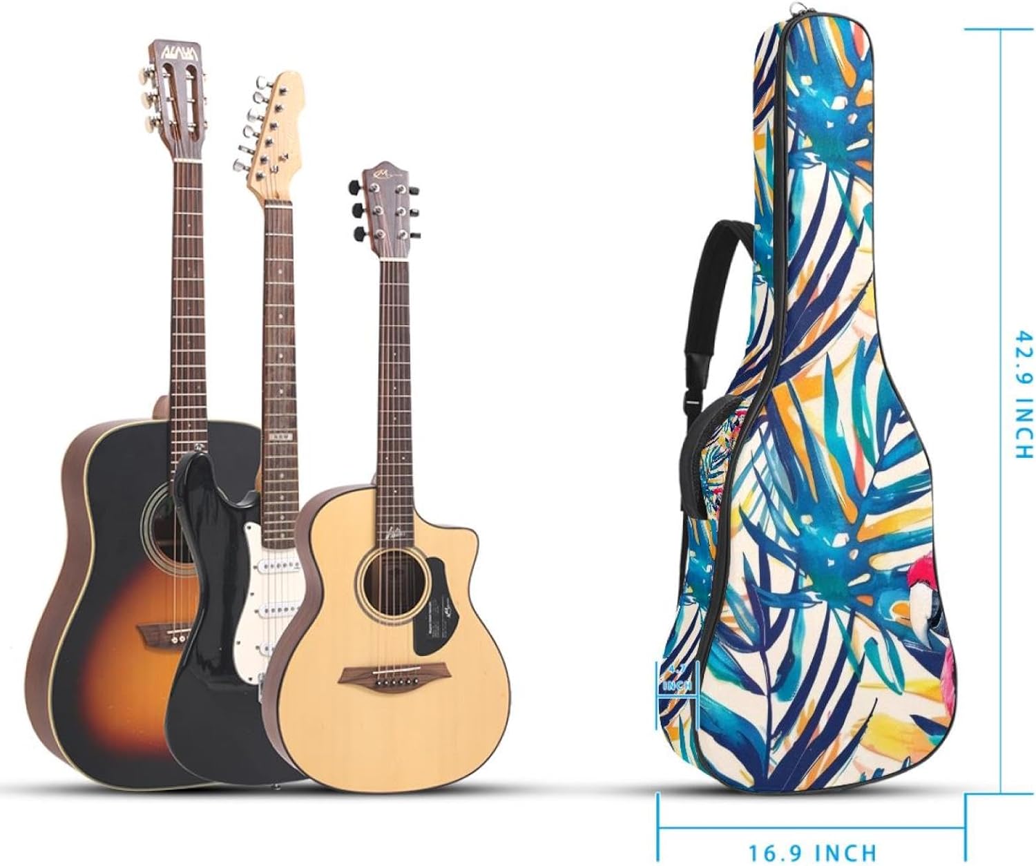 Specifications:Material: waterproof Oxford and waterproof zipper;Size: 42.9’’ x 16.9’’ x 4.7’’, perfect for 40'' 41'' 42'' guitar;Weight:36oz/1020g, lightweight;Color: Multi-color.Features:1. Adjustable backpack shoulder straps and padded side carry handle for more pleasant carrying choices.2. 10mm thick sponge padding inside provide protection for your musical instrument; and fixed Velcro above neck and body keep your acoustic guitar bag safer.3. This guitar bag comes with back hanger loop can be hung on the wall. Save more space when not in use.4. Two pockets for storage convenience, 1 large capacity pocket on outside back and 1 small pocket on the inside neck.5. Cute printed guitar gig bag guitar case backpack, ideal as a gift for your relatives or friends who love music when birthday, Thanksgiving, Christmas, holidays, and other special events.