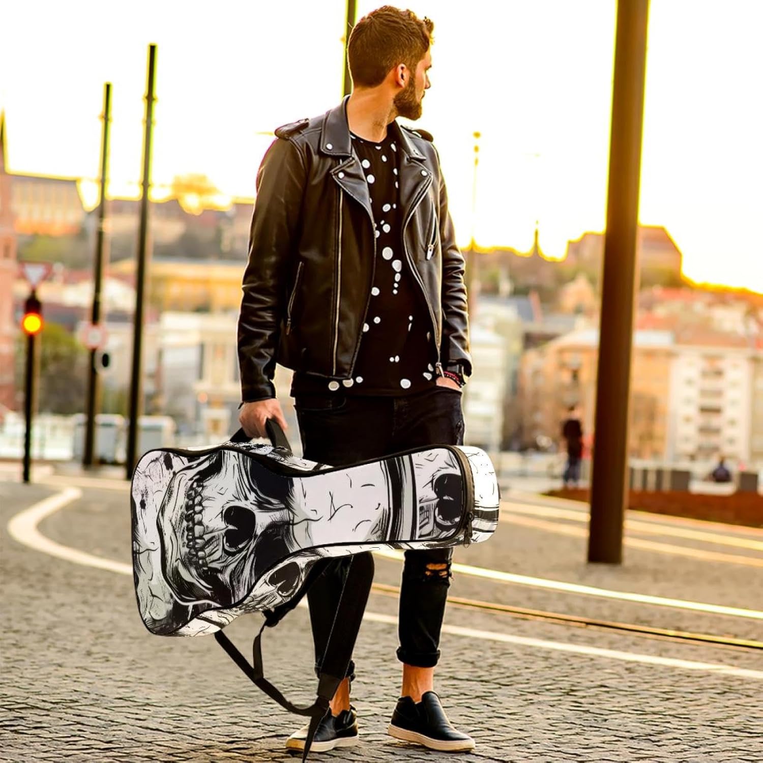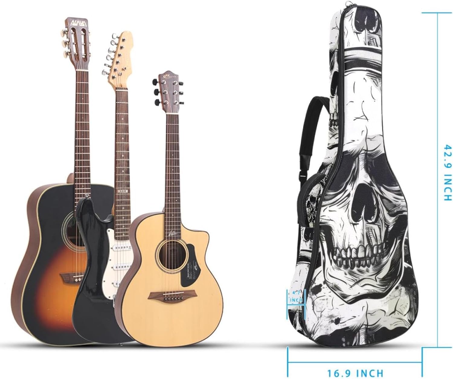 Specifications:Material: waterproof Oxford and waterproof zipper;Size: 42.9’’ x 16.9’’ x 4.7’’, perfect for 40'' 41'' 42'' guitar;Weight:36oz/1020g, lightweight;Color: Multi-color.Features:1. Adjustable backpack shoulder straps and padded side carry handle for more pleasant carrying choices.2. 10mm thick sponge padding inside provide protection for your musical instrument; and fixed Velcro above neck and body keep your acoustic guitar bag safer.3. This guitar bag comes with back hanger loop can be hung on the wall. Save more space when not in use.4. Two pockets for storage convenience, 1 large capacity pocket on outside back and 1 small pocket on the inside neck.5. Cute printed guitar gig bag guitar case backpack, ideal as a gift for your relatives or friends who love music when birthday, Thanksgiving, Christmas, holidays, and other special events.