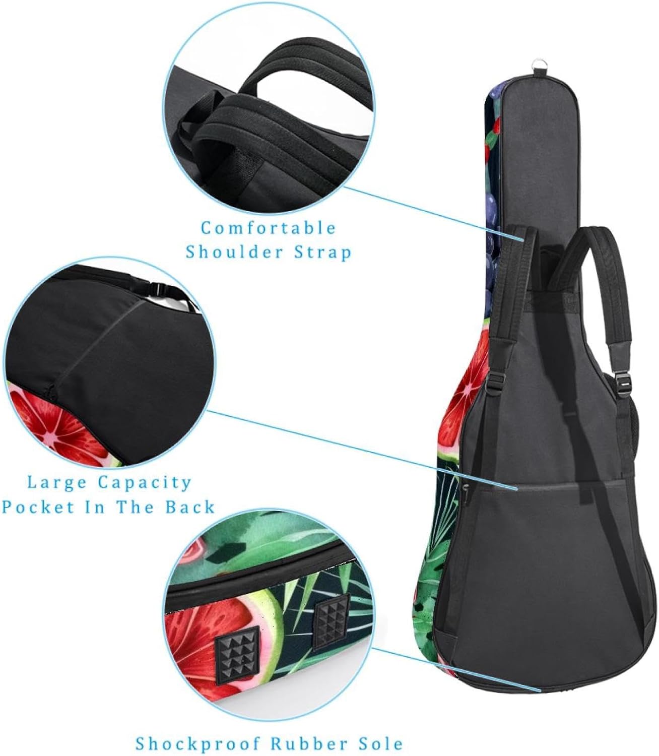 Specifications:Material: waterproof Oxford and waterproof zipper;Size: 42.9’’ x 16.9’’ x 4.7’’, perfect for 40'' 41'' 42'' guitar;Weight:36oz/1020g, lightweight;Color: Multi-color.Features:1. Adjustable backpack shoulder straps and padded side carry handle for more pleasant carrying choices.2. 10mm thick sponge padding inside provide protection for your musical instrument; and fixed Velcro above neck and body keep your acoustic guitar bag safer.3. This guitar bag comes with back hanger loop can be hung on the wall. Save more space when not in use.4. Two pockets for storage convenience, 1 large capacity pocket on outside back and 1 small pocket on the inside neck.5. Cute printed guitar gig bag guitar case backpack, ideal as a gift for your relatives or friends who love music when birthday, Thanksgiving, Christmas, holidays, and other special events.
