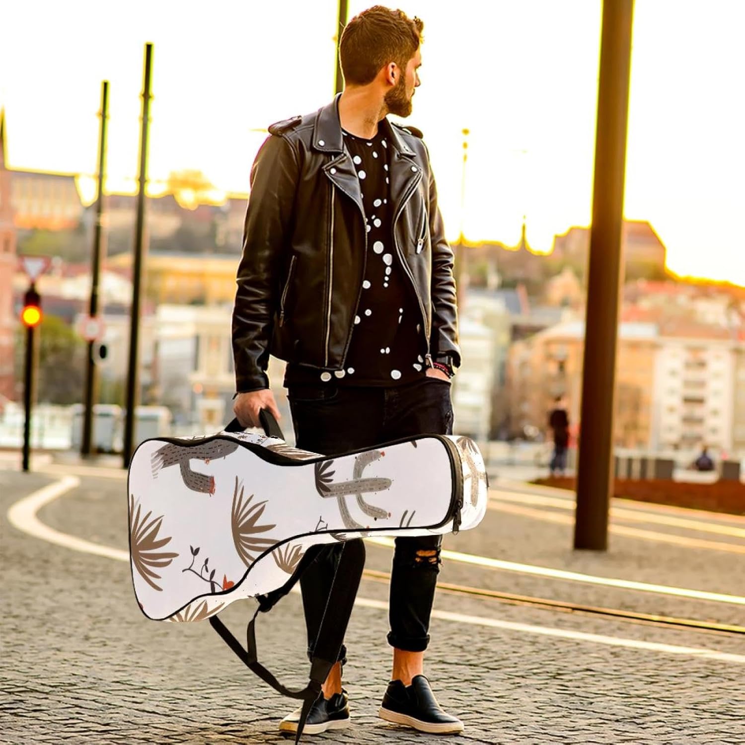 Specifications:Material: waterproof Oxford and waterproof zipper;Size: 42.9’’ x 16.9’’ x 4.7’’, perfect for 40'' 41'' 42'' guitar;Weight:36oz/1020g, lightweight;Color: Multi-color.Features:1. Adjustable backpack shoulder straps and padded side carry handle for more pleasant carrying choices.2. 10mm thick sponge padding inside provide protection for your musical instrument; and fixed Velcro above neck and body keep your acoustic guitar bag safer.3. This guitar bag comes with back hanger loop can be hung on the wall. Save more space when not in use.4. Two pockets for storage convenience, 1 large capacity pocket on outside back and 1 small pocket on the inside neck.5. Cute printed guitar gig bag guitar case backpack, ideal as a gift for your relatives or friends who love music when birthday, Thanksgiving, Christmas, holidays, and other special events.